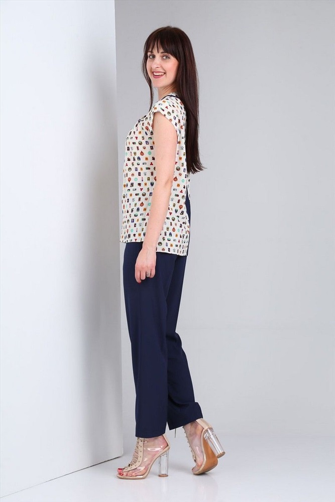 Стильный женский комплект брюки + блуза. Модель выполнена из качественной летней ткани с современным дизайном. Горловина в блузе обработана обтачкой в шов притачивания подкладки вставлен отделочный кант , по спинке блузы вставлен отделочный элемент по среднему шву , отделочный элемент бант(съемный). Верхний срез брюк обработан поясом, по задним половинкам брюк настрочные карманы.