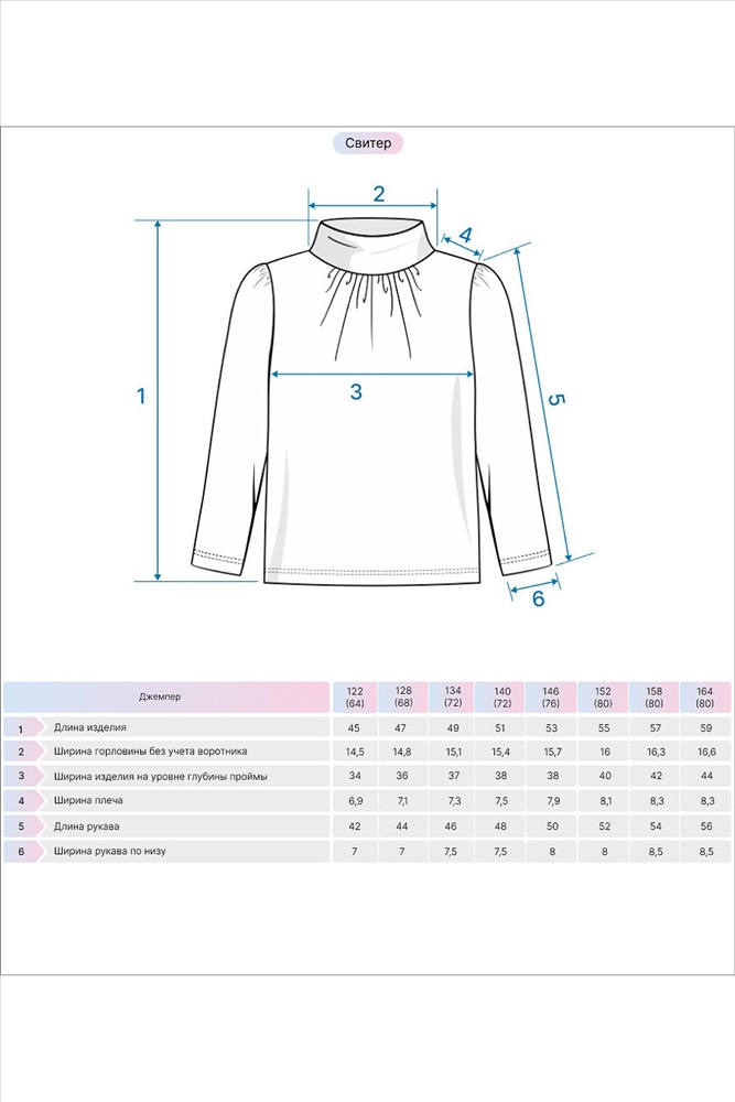 ID товара: 984395 Состав: 95% Хлопок, 5% Эластан Сезон: Демисезон Длина: Средняя Фасон: Прямой Рукав: длинные Вырез горловины: Воротник-стойка Основная ткань: Кулирная гладь Стиль: Базовый Плотность: 180 Страна бренда: Россия Страна производства: Россия Свитер (водолазка) для девочки прямого покроя, с втачным длинным рукавом. Горловина круглая, обработана воротником-стойкой, из основного полотна. Рукав длинный втачной, низ рукава обработан швом в подгибку. На полочке по горловине, по окату рукава сборка. Низ изделия обработан швом в подгибку. Комментарии к товару