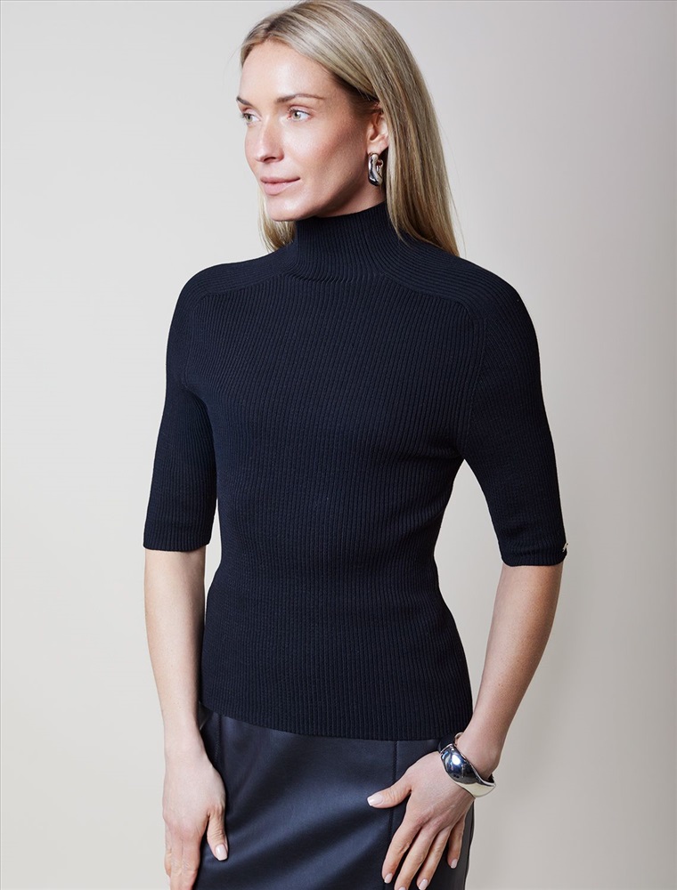 Размер товара на первом фото: 42 Водолазка тонкой вязки в рубчик выполнена из хлопка. Лаконичная модель с коротким рукавом дополнена металлическим логотипом бренда. Изделие идеально сидит по фигуре и не сковывает движений. Мягкая пряжа очень приятная к телу не колется и сохраняет тепло при этом не перегревая.