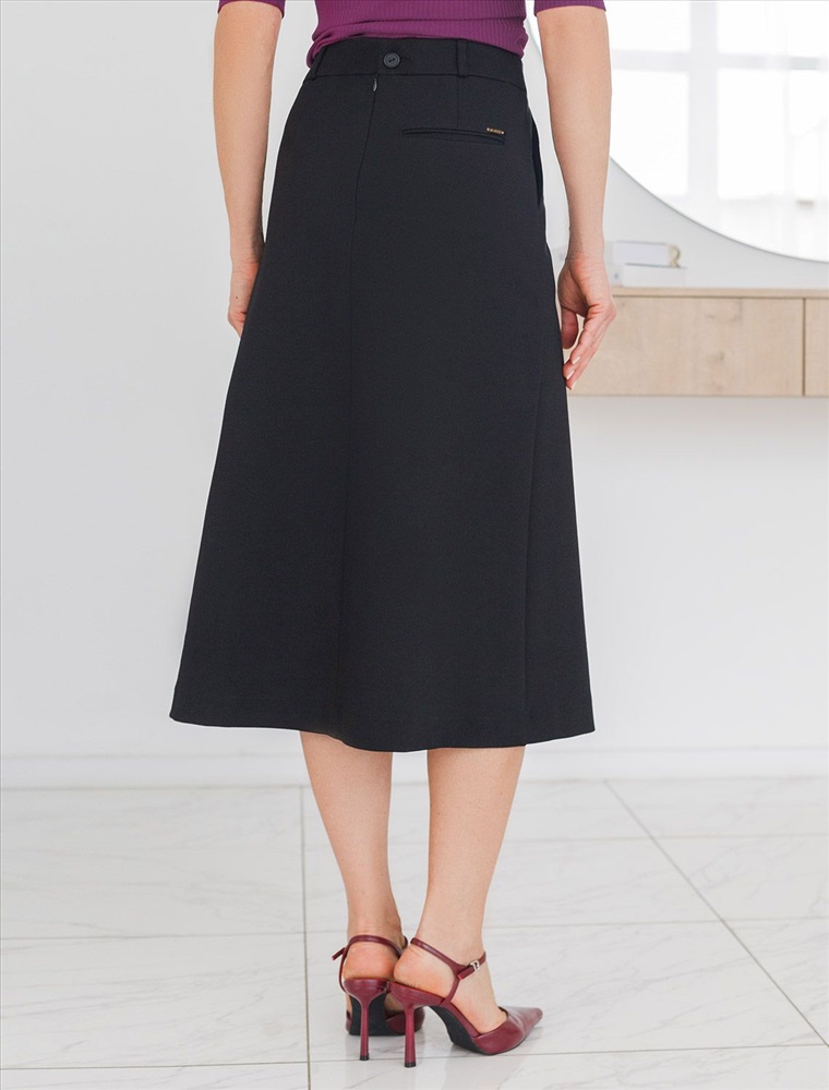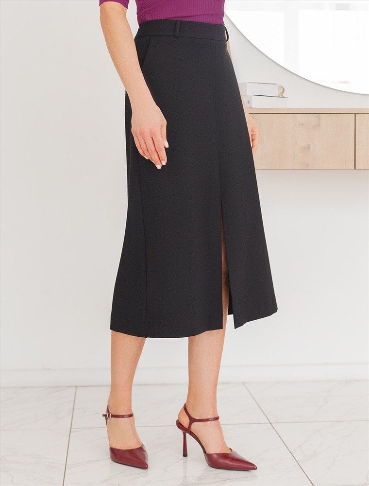 Плотность: 390 Г/м2 Юбка А-силуэта выполнена из джерси. Модель дополнена шлевками для пояса, высоким разрезом спереди и боковыми карманами. Изделие хорошо держит форму, отлично тянется и почти не мнется во время использования. Идеальный вариант в офис или в повседневный классический стиль.