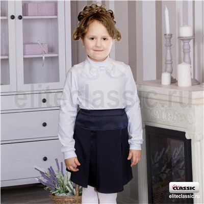 Описание: Юбка на притачном поясе с резиной по бокам, расширенная к низу, на кокетке из отделочной ткани. Переднее полотнище юбки с бантовыми складками из отделочной ткани. Юбка предназначена для девочек младших классов.