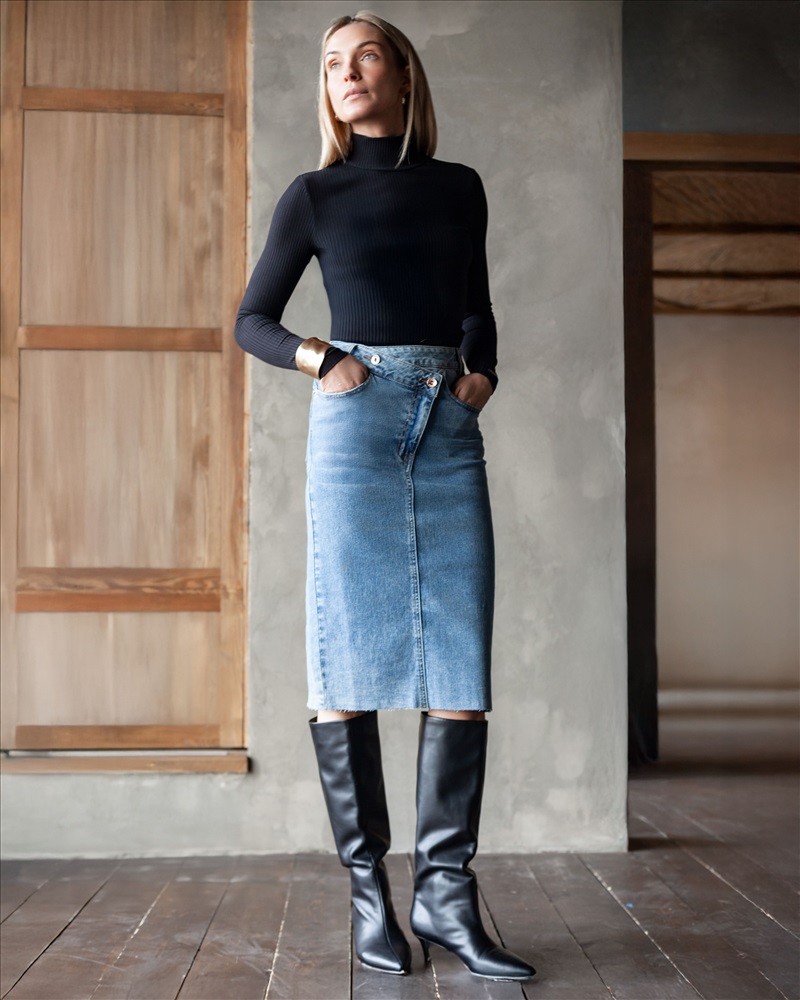 Юбка выполнена из эластичного денима. Модель с трендовой ассиметричной застежкой и декоративной стиркой дополнена краем с открытым срезом и потертостями. Изделие прямого кроя длиной чуть ниже колен с разрезом сзади дополнено брендированным патчем и высококачественной фурнитурой.