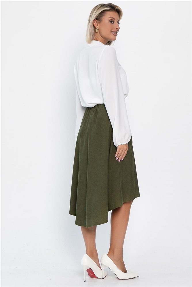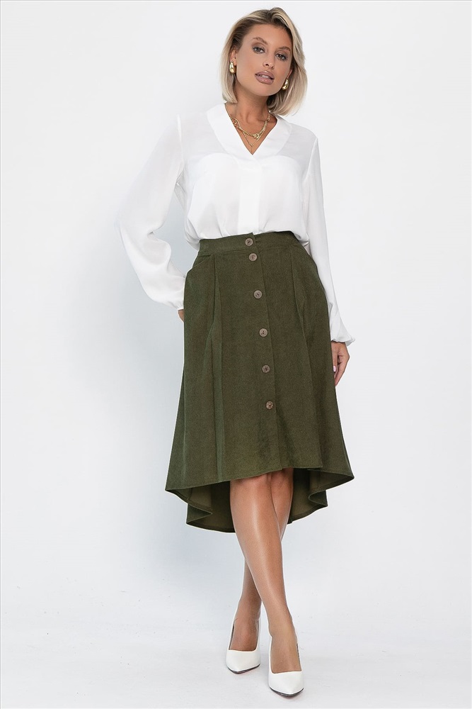 Вельветовая юбка в оттенке хаки длиной миди — это то, что подчеркнет вашу фигуру и добавит стильного шарма вашему образу! Благодаря своему трендовому силуэту и трапециевидной форме, она станет идеальным вариантом для деловых встреч, вечеринок или прогулок по городу.