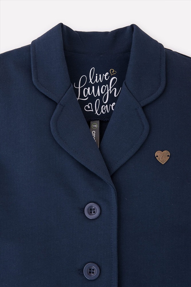 Жакет для девочки из петельчатого футера в благородном цвете "индиго". Борта закруглены снизу. Украшен принтом на спинке с внутренней стороны и декоративным металлическим сердечком на груди. Впереди клапаны-обманки. Застёгивается на три пуговицы.