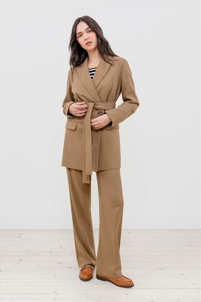 Двубортный жакет прямого силуэта из костюмной ткани орехового цвета. Воротник английский, рукав втачной полной длины. Застёжка спереди на две крупные пуговицы. В комплект входит пояс из основной ткани для создания более приталенного силуэта.