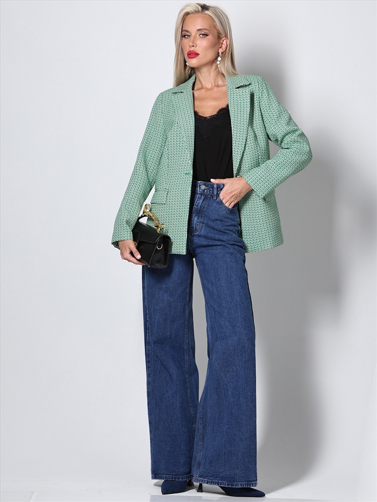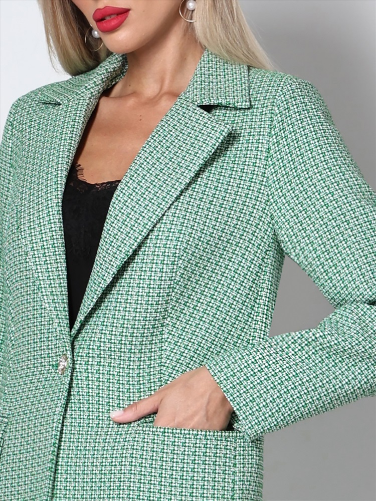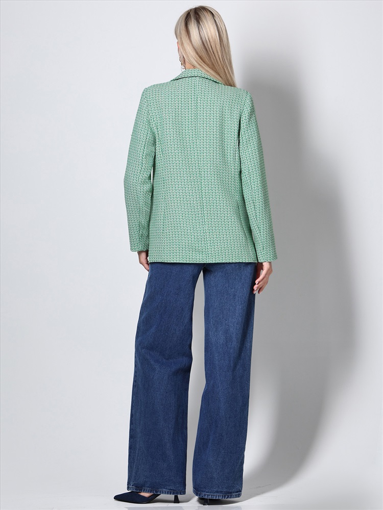 Жакет выполнен из костюмной ткани, обеспечивая элегантный и профессиональный вид. Зеленый цвет делает его универсальным и легко сочетаемым с различными элементами гардероба. Застежка на пуговицу обеспечивает легкость при надевании и снятии, а также добавляет изысканности образу. Отложной воротничок придает жакету изысканный вид и подчеркивает его стиль. Длинные рукава делают жакет подходящим для прохладной погоды, обеспечивая комфорт и защиту от холода.