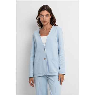 Однобортный, прямой немного удлиненный жакет с застежкой на пуговицы и двумя накладными карманами. Все трикотажные изделия производятся в соответствии с нормами Швейцарского сертификата ЭкоТекс. Сделано в России