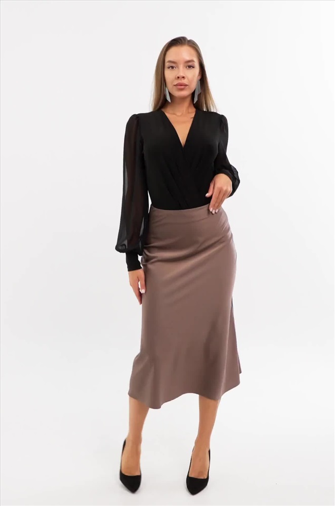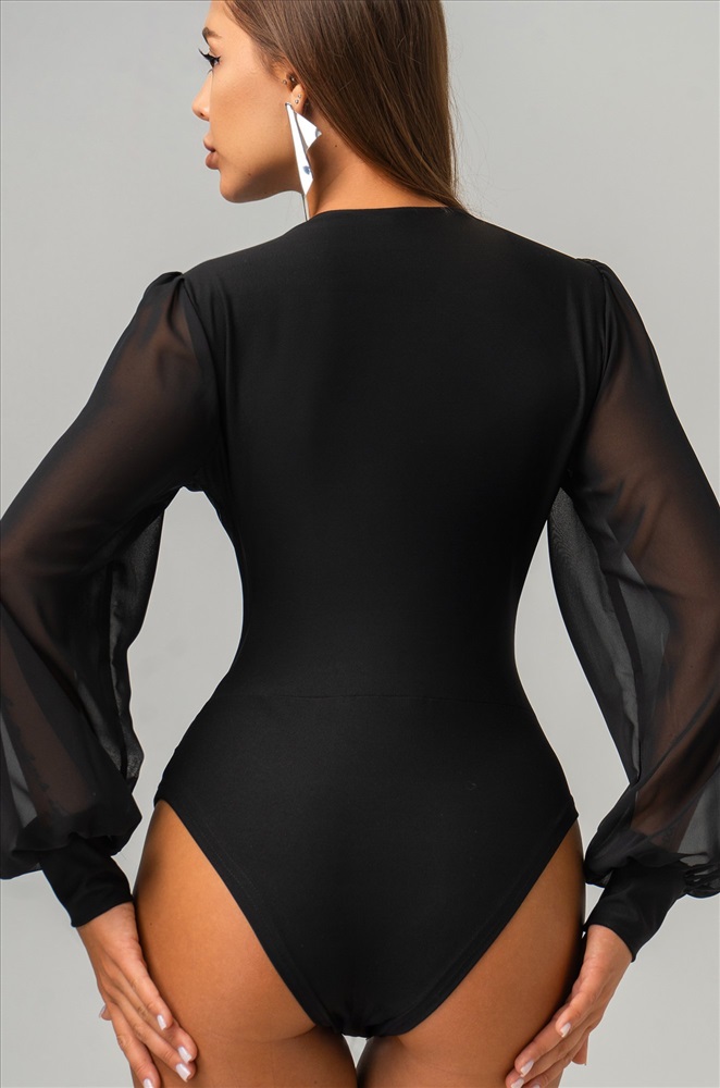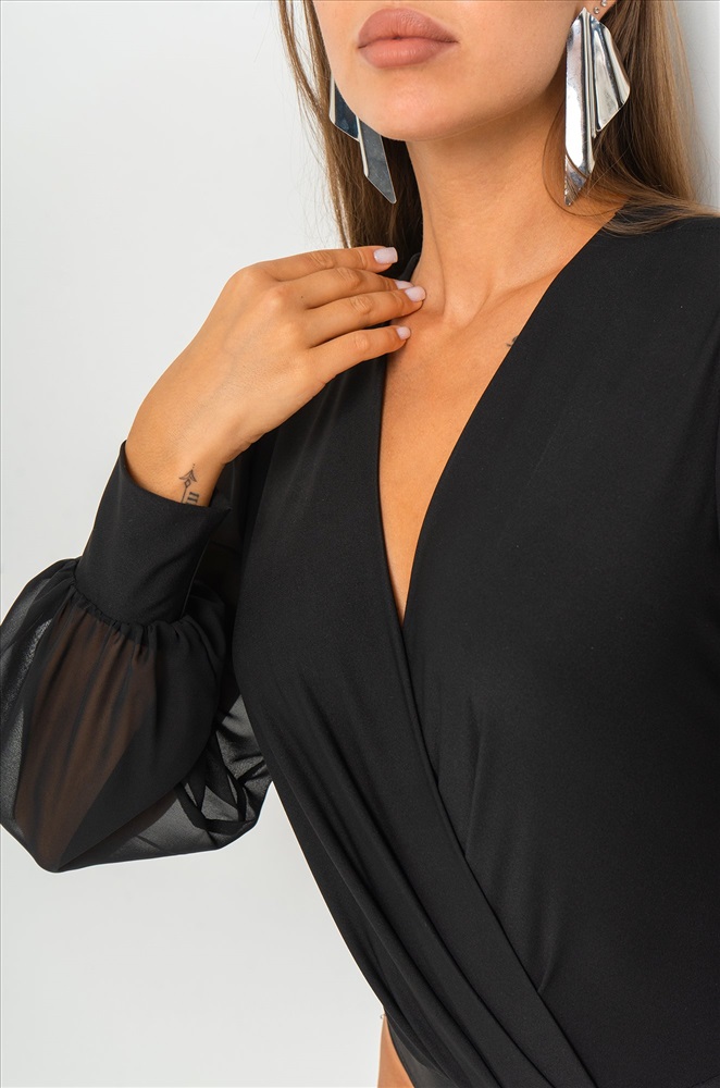 Погрузитесь в мир элегантности с черной женской блузкой-боди! Эта нарядная модель с глубоким V-образным вырезом и драпировкой создаст незабываемый образ, привлекая внимание и подчеркивая вашу женственность.