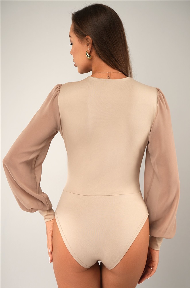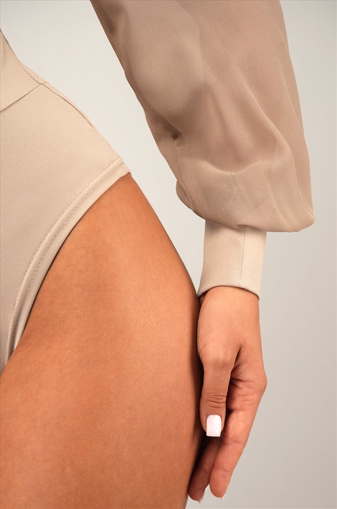 — бежевая блузка-боди с v-вырезом выгодно подчеркивает линию декольте;