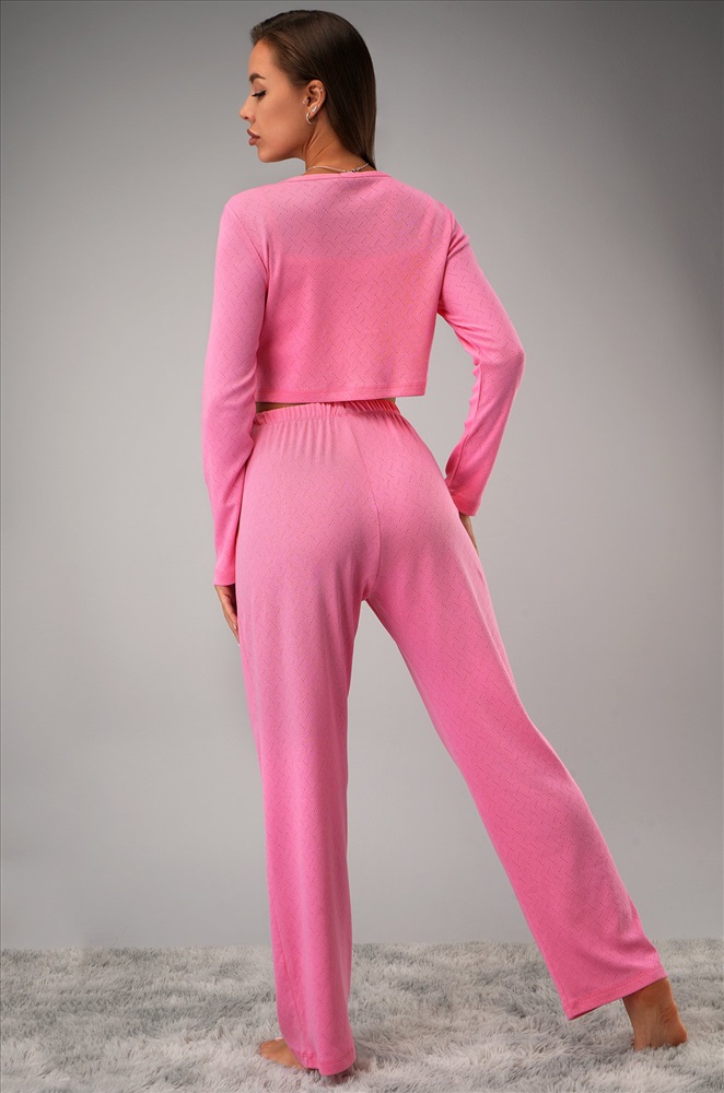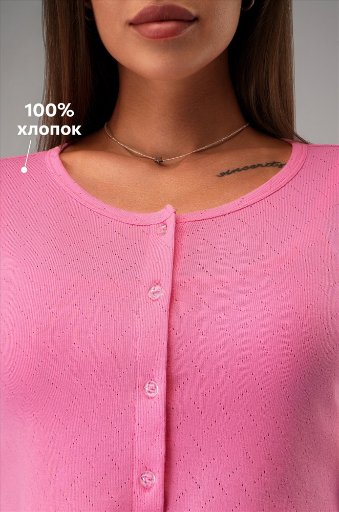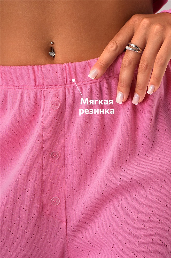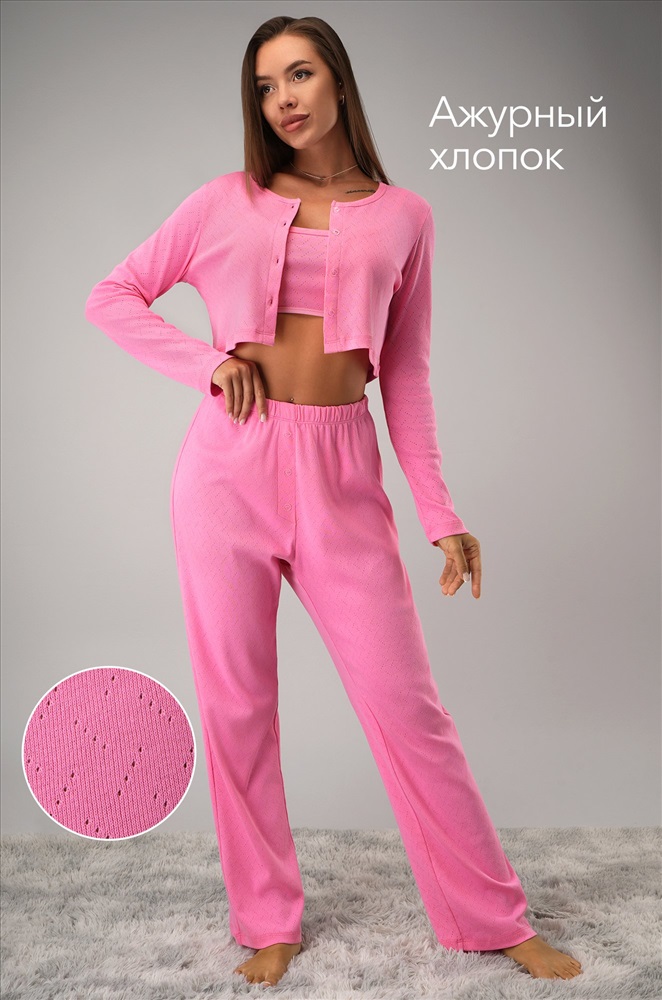 Преимущества: — лёгкий ажурный трикотаж из 100% хлопка; — пижама 3-в-1: в наборе топ, кофта на пуговицах с длинными рукавами и брюки; — брюки с высокой посадкой и мягкой резинкой; — декоративные пуговицы на штанах; — нежный розовый цвет. Хлопковая пижамка для девушек и женщин – прекрасный вариант для домашних образов. Розовый пижамный комплект адаптируется под настроение: можно носить весь набор или комбинировать элементы между собой. Рост модели 170 см, параметры: 88-67-97 см. На ней размер 44.