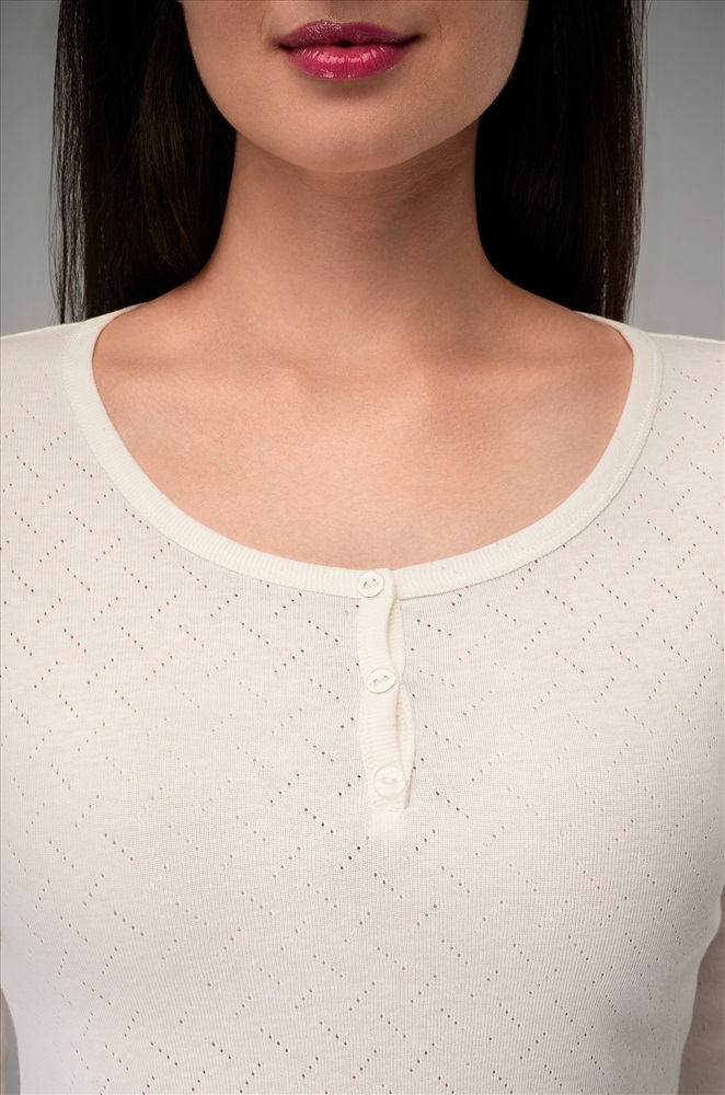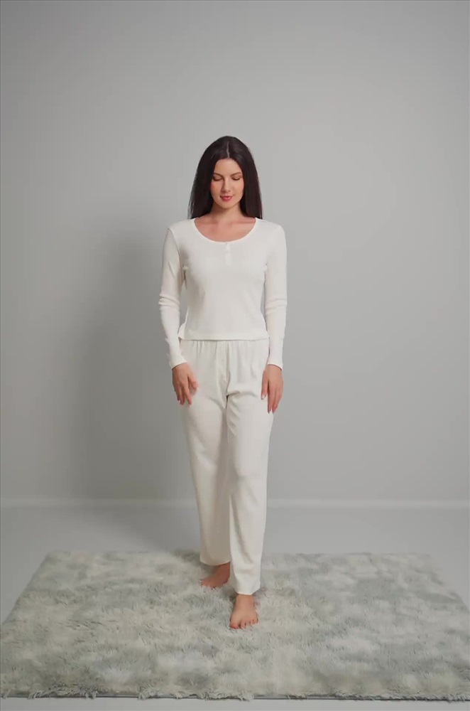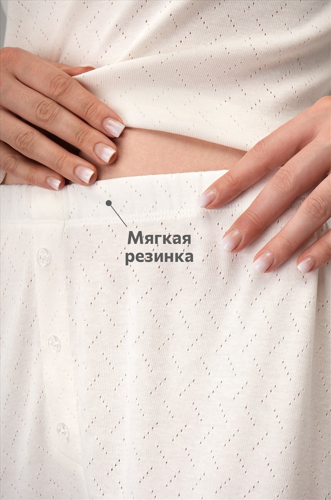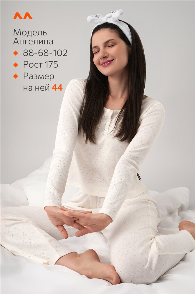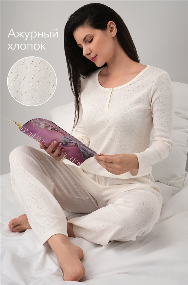 Преимущества: – ажурный трикотаж с фактурным рисунком; – кофта облегающего кроя с длинными рукавами; – широкие брюки с резинкой и декоративными пуговками; – мягкая и дышащая из 100% хлопка; – подходит на каждый день. Женская пижама со штанами — идеальный домашний вариант для сна и отдыха. Ажурная пижама для женщин комфортно садится по фигуре и дарит ощущение нежности в любое время суток. Рост модели 175 см, параметры 88-68-102 см. На ней размер 44.