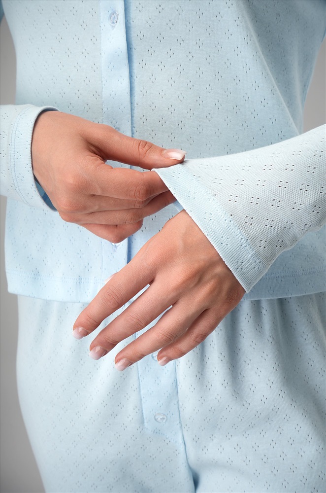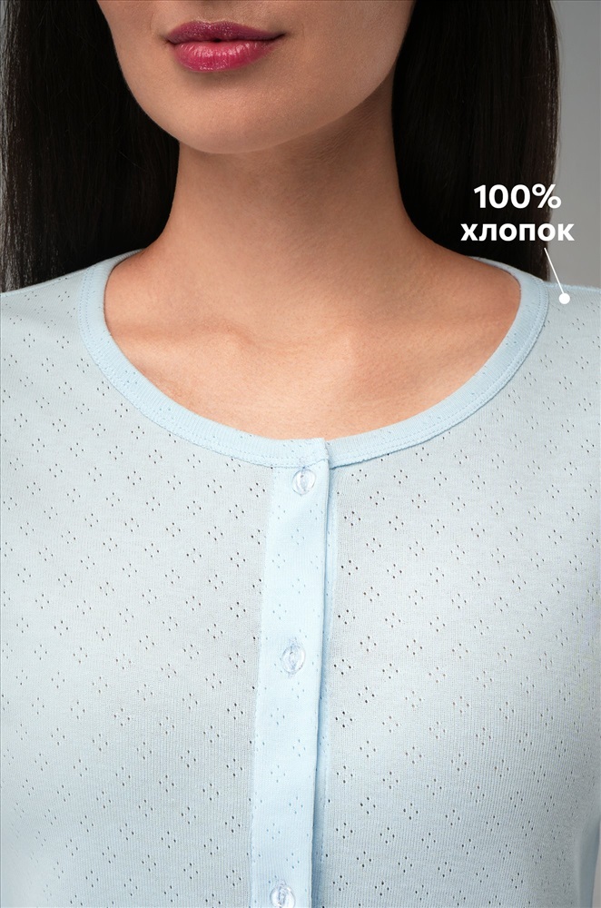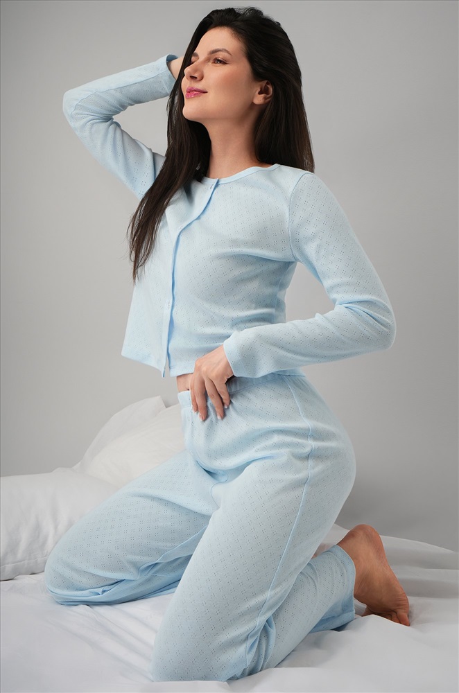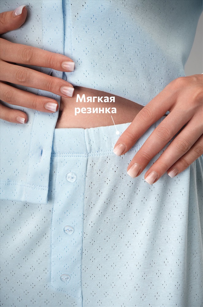 Голубая пижамка с брюками — уют, который всегда под рукой. Ажурная фактура и мягкий трикотаж создают приятные ощущение с первого прикосновения.