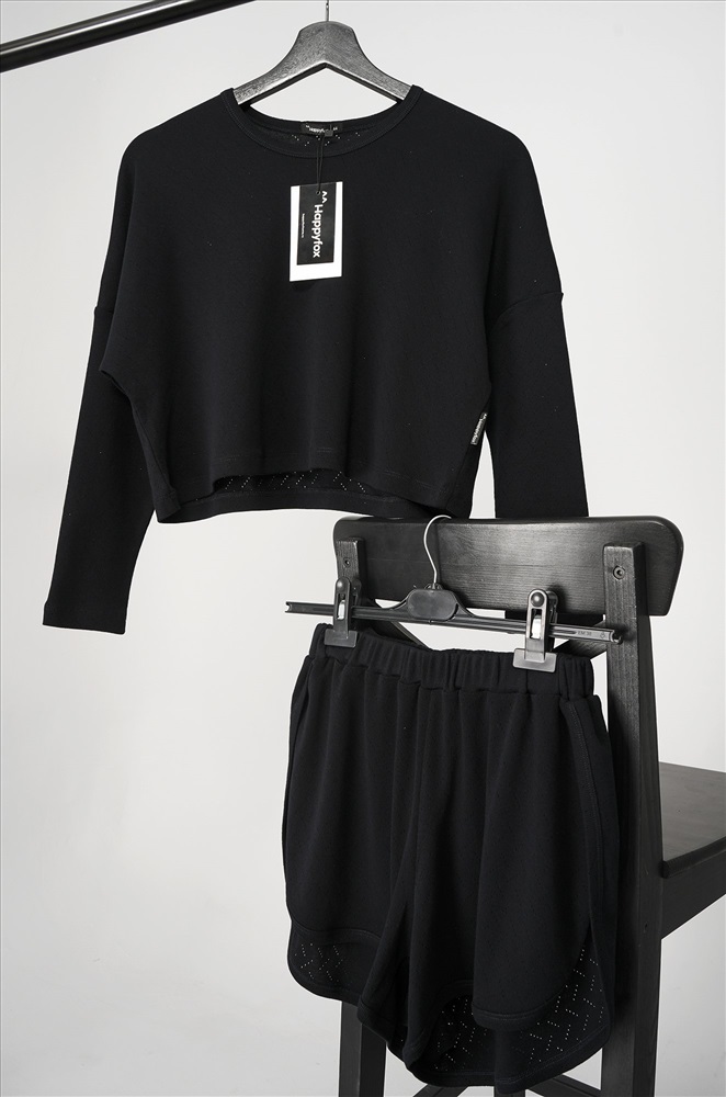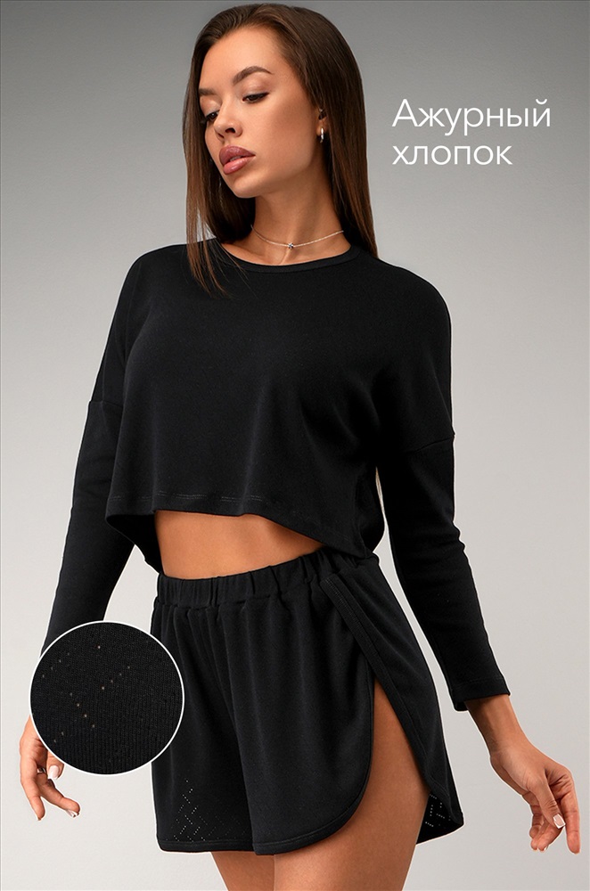 Почувствуйте гармонию с ажурной пижамой черного цвета! Женский комплект с укороченным лонгсливом и шортами просто создан для уютных домашних вечеров. Легкая модель подарит максимум комфорта и немного кокетства.