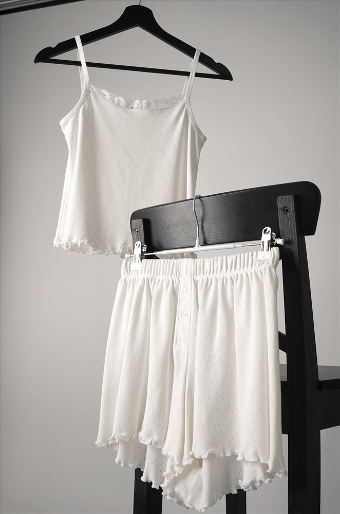 Ажурная пижамка с волнистыми краями — это максимум комфорта и немного кокетства в одном комплекте. Лёгкая, воздушная — она словно создана для самых приятных домашних вечеров.