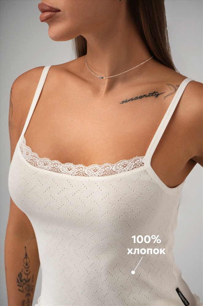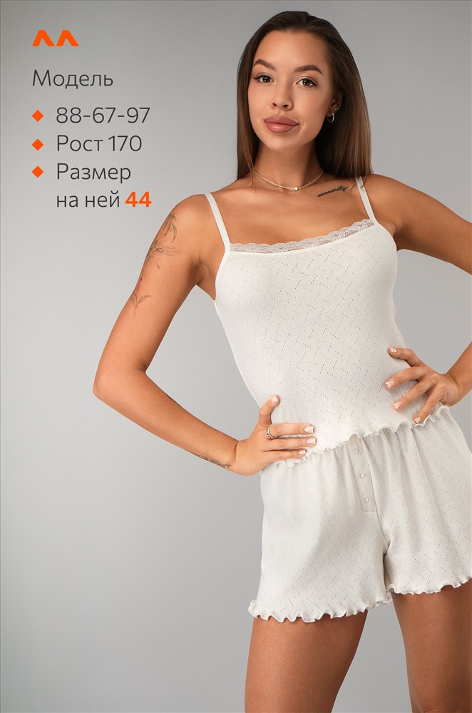 Преимущества: – 100% хлопок — мягкий и дышащий; – фактурная трикотажная ткань; – маечка с тонкими лямками и кружевом; – шортики с пуговичками и удобным поясом на резинке; – женственная, на каждый день. Женский комплект из майки с шортами в молочном цвете — отличный выбор для сна или отдыха. Хлопковая пижама для женщин смотрится особенно уютно и аккуратно, подчёркивая настроение домашней свободы и расслабленности. Рост модели 170 см, параметры 88-67-97 см. На ней размер 44.