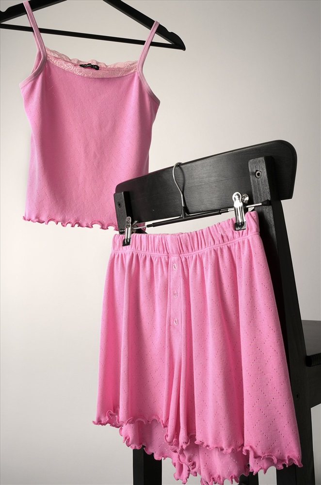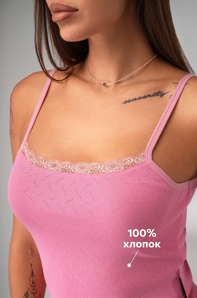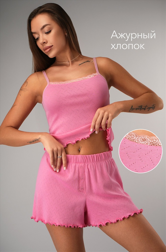 Преимущества: – 100% хлопок — мягкий и дышащий; – фактурная трикотажная ткань; – маечка с тонкими лямками и кружевом; – шортики с пуговичками и удобным поясом на резинке; – женственная, на каждый день. Женский комплект из майки с шортами в розовом цвете — отличный выбор для сна или отдыха. Хлопковая пижама для женщин смотрится особенно уютно и аккуратно, подчёркивая настроение домашней свободы и расслабленности. Рост модели 170 см, параметры 88-67-97 см. На ней размер 44.