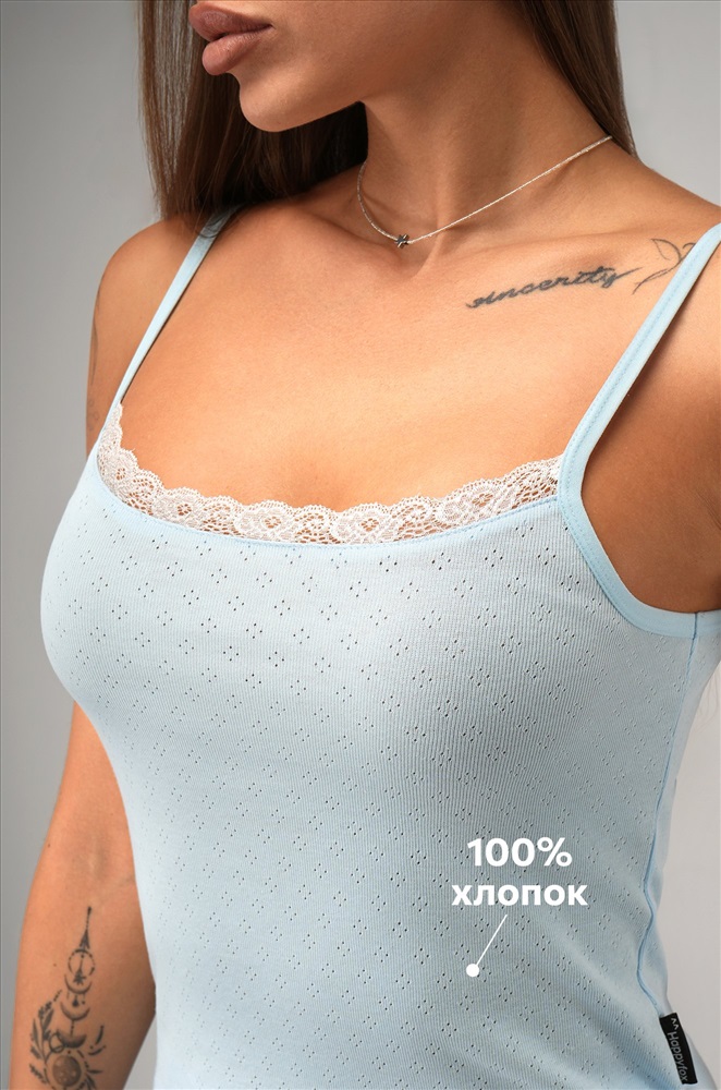 Преимущества: – натуральный 100% хлопок в составе; – трикотажная ткань с фактурной текстурой; – маечка на тонких лямках с кружевной отделкой; – шорты на резинке — удобно и легко; – однотонная и универсальная — на каждый день. Домашний комплект из майки с шортами отлично подойдёт для сна, отдыха и расслабленного утра. Хлопковая ажурная пижама для женщин выглядит особенно уютно благодаря мягкому прилегающему силуэту. Рост модели 170 см, параметры 88-67-97 см. На ней размер 44.