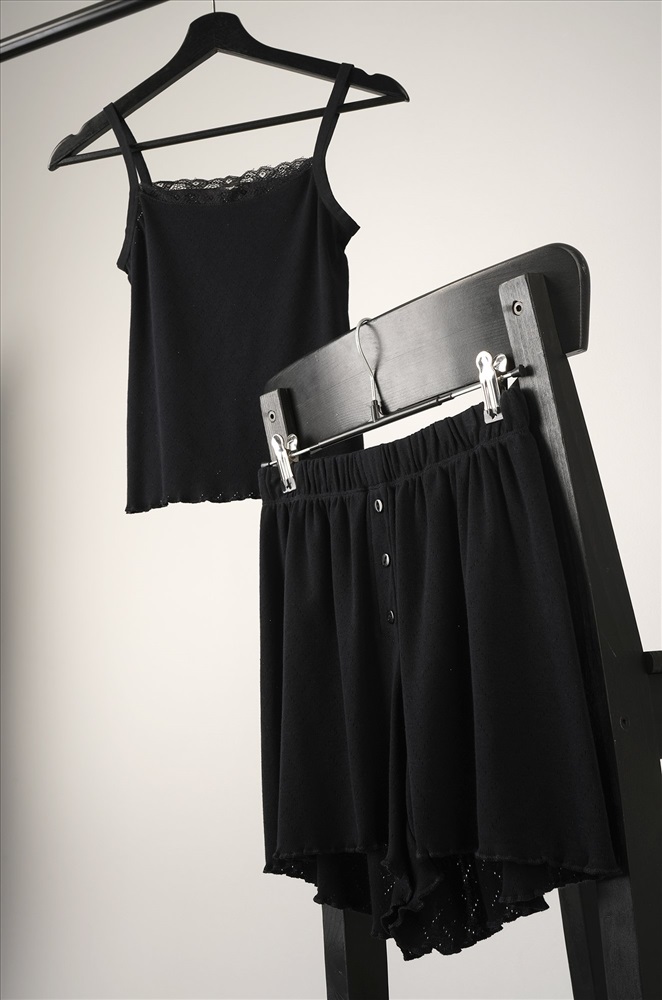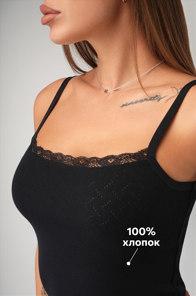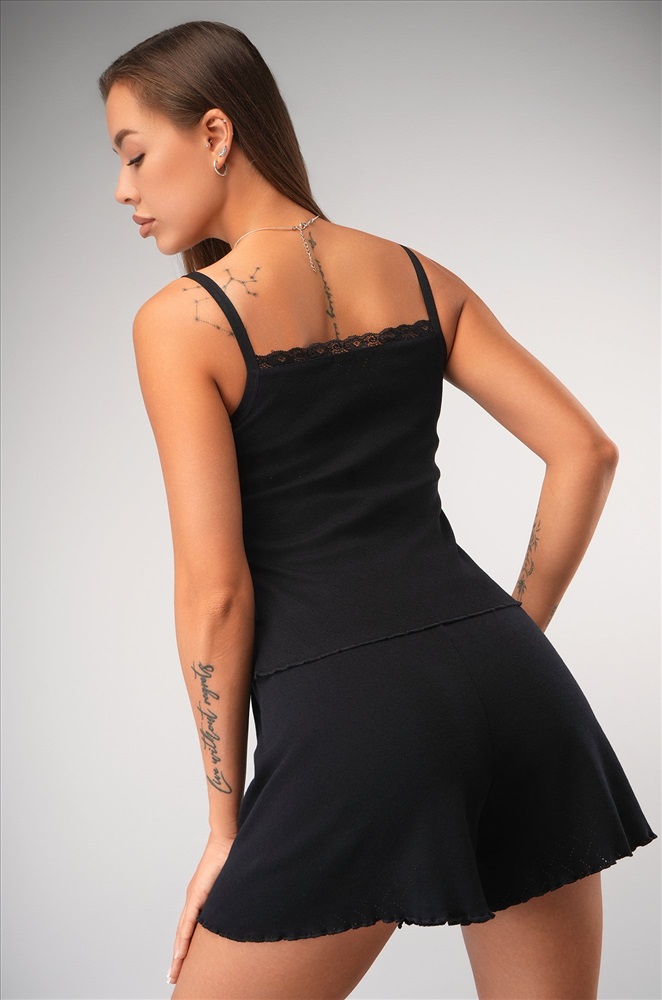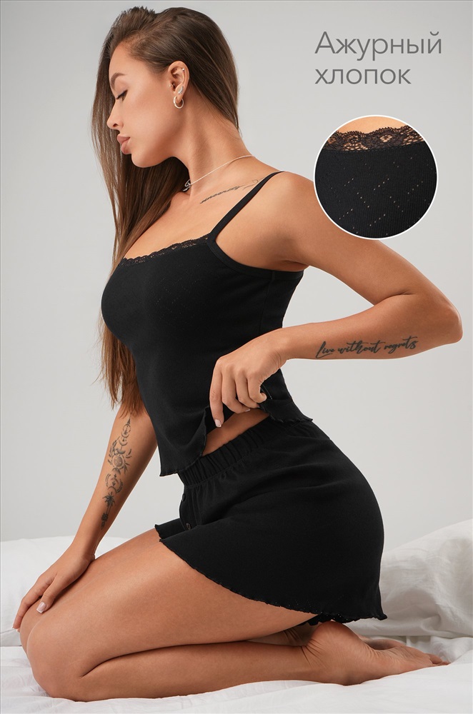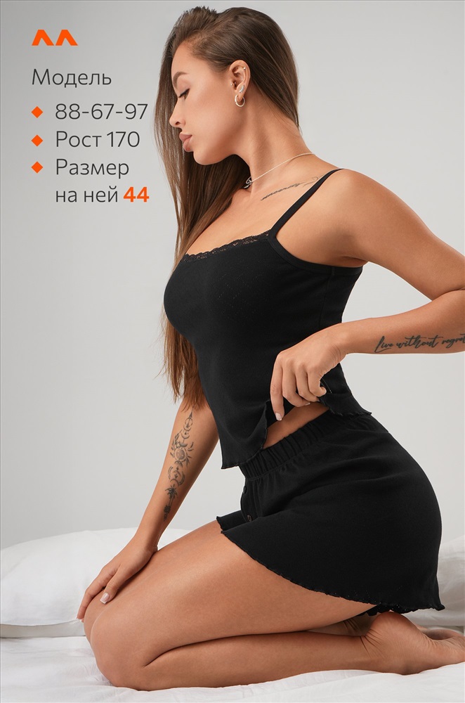 Преимущества: – 100% хлопок — мягкий и дышащий; – фактурная трикотажная ткань; – маечка с тонкими лямками и кружевом; – шортики с пуговичками и удобным поясом на резинке; – женственная, на каждый день. Женский комплект из майки с шортами в черном цвете — отличный выбор для сна или отдыха. Хлопковая пижама для женщин смотрится особенно уютно и аккуратно, подчёркивая настроение домашней свободы и расслабленности. Рост модели 170 см, параметры 88-67-97 см. На ней размер 44.