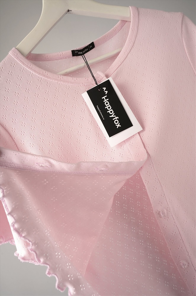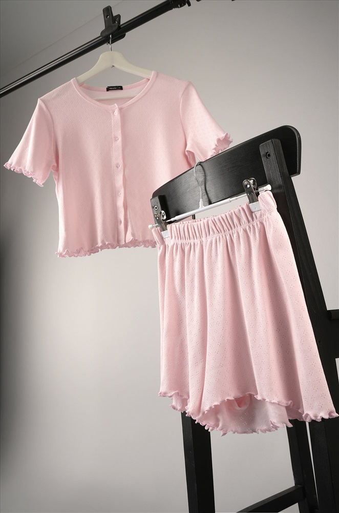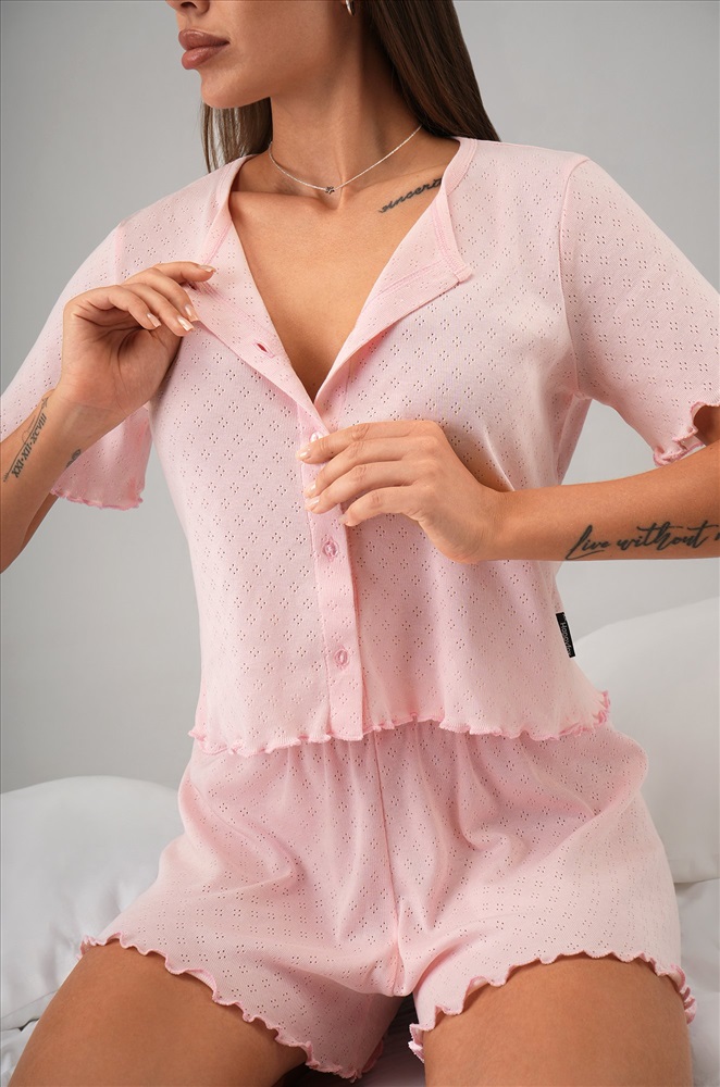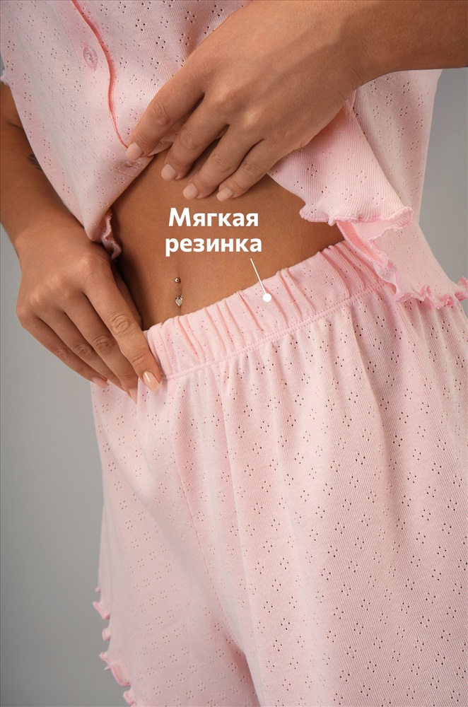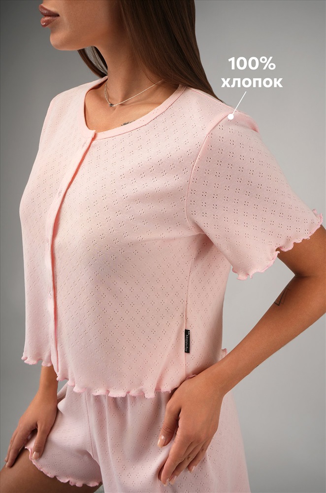 Преимущества: — лёгкий ажурный трикотаж из 100% хлопка; — волнистые края добавляют нежности; — в наборе укороченная футболка и шорты; — короткие шортики с высокой посадкой и мягкой резинкой; — футболка с застежкой на пуговицы; — пастельный розовый цвет. Хлопковая пижамка для девушек и женщин – прекрасный вариант для домашних образов. Розовый пижамный комплект идеален на каждый день. Рост модели 177 см, параметры: 85-66-90 см. На ней размер 44.
