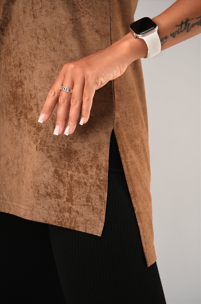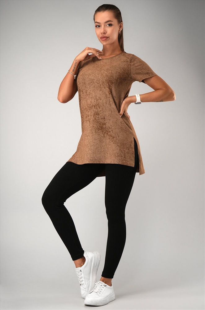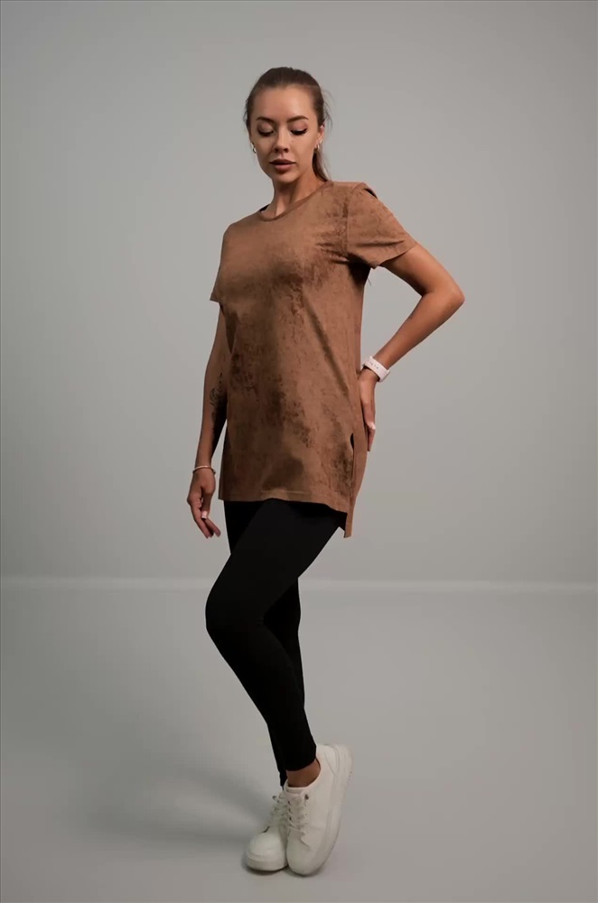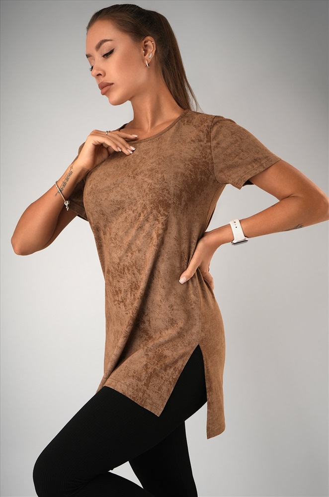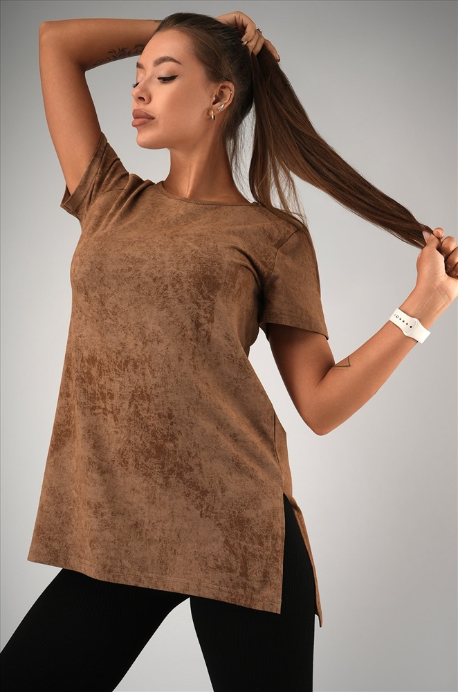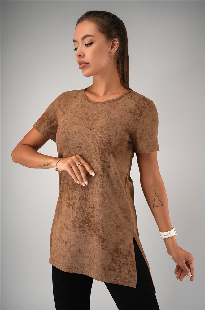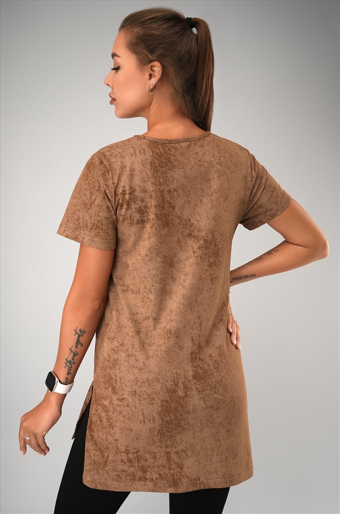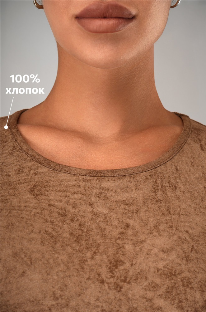 Женская футболка-туника с эффектом варенка – стильное решение для лета. Выполнена из мягкого 100% хлопка в карамельном оттенке с уникальной текстурой легкой потертости.