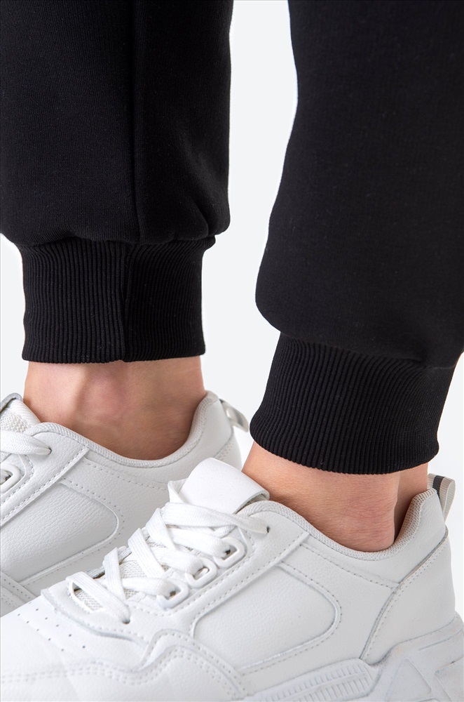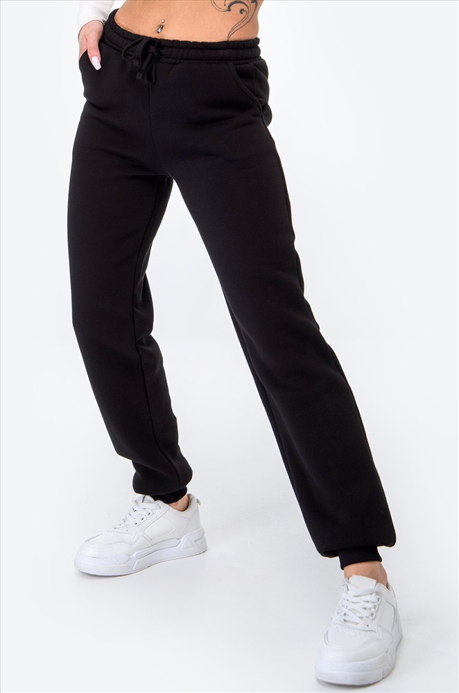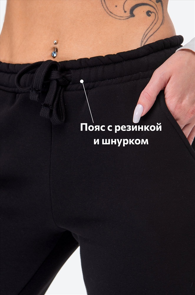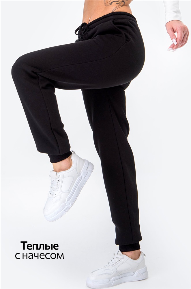 Теплые женские брюки с начесом – комфортный вариант для прохладных дней. Однотонные джоггеры выполнены из мягкого хлопка и представлены в базовом черном цвете. Удобные карманы, пояс на резинке, регулирующийся шнурком, манжеты – каждая деталь создана для вашего комфорта этой осенью.