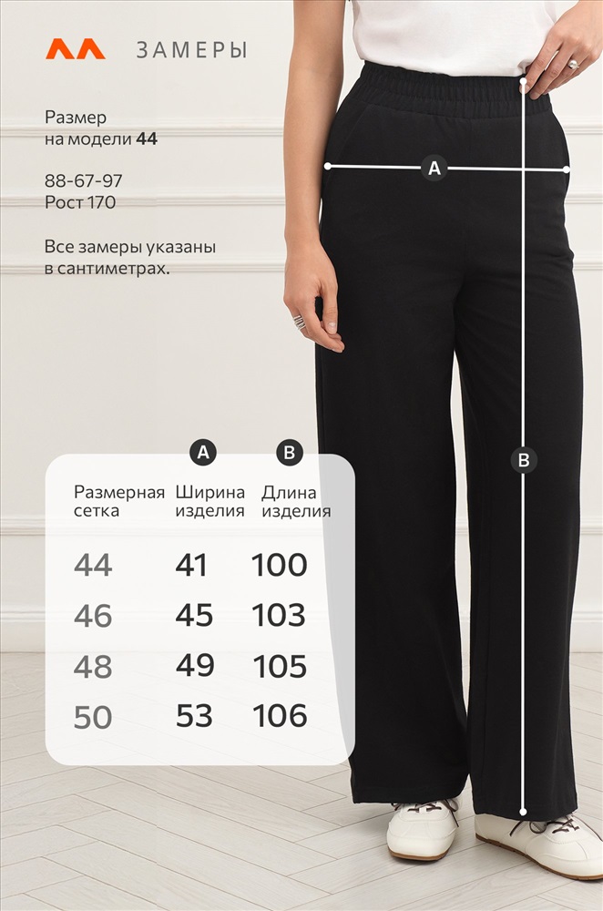Размер 44: длина по внешнему шву:100 см; длина по внутреннему шву:68 см; ширина по бедрам:41 см.