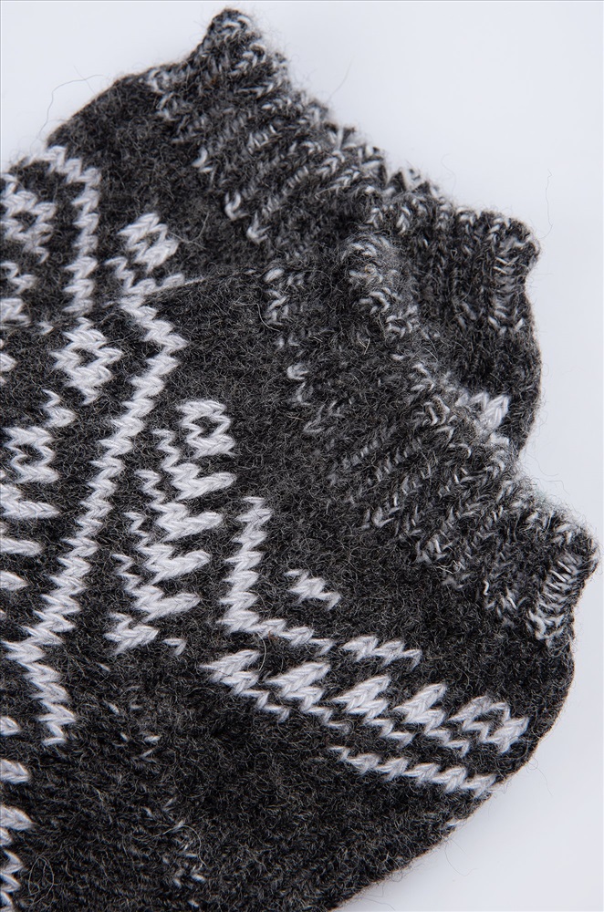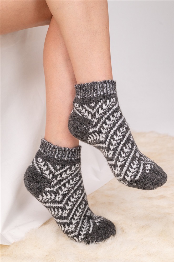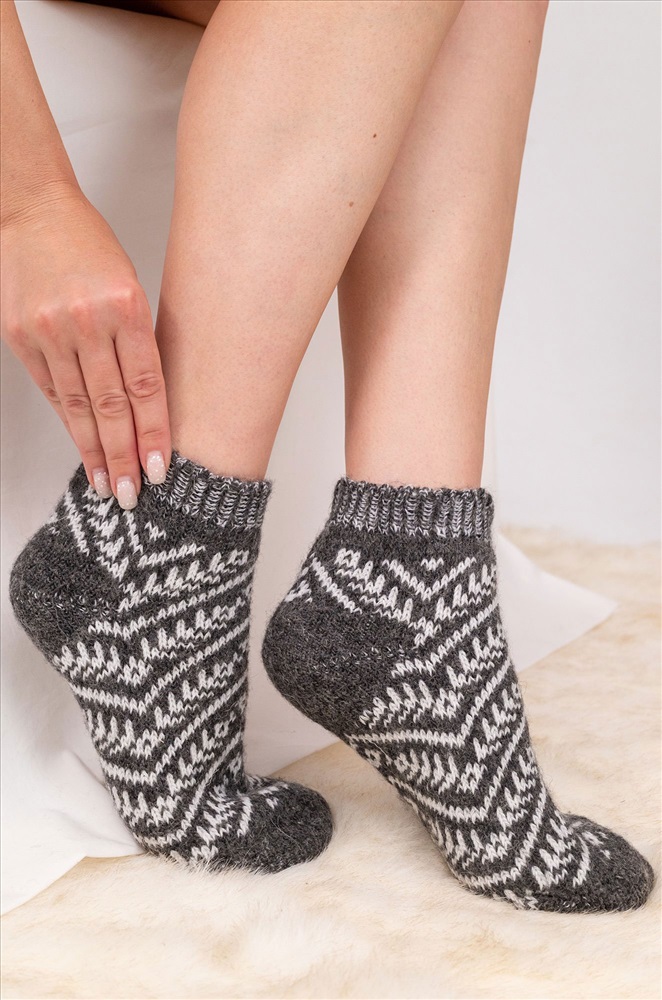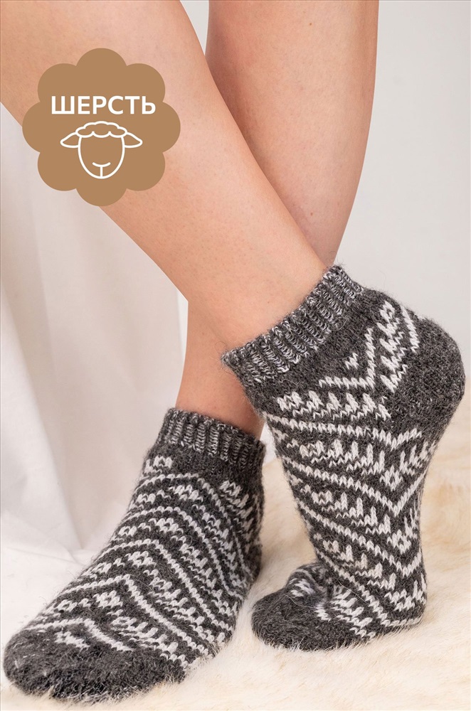 Теплые женские носки выполнены из натуральной шерстяной пряжи. Короткие носки представлены в сером цвете и украшены узором. Вязаные шерстяные носочки идеальны для уютных зимних вечеров в компании пледа и какао.
