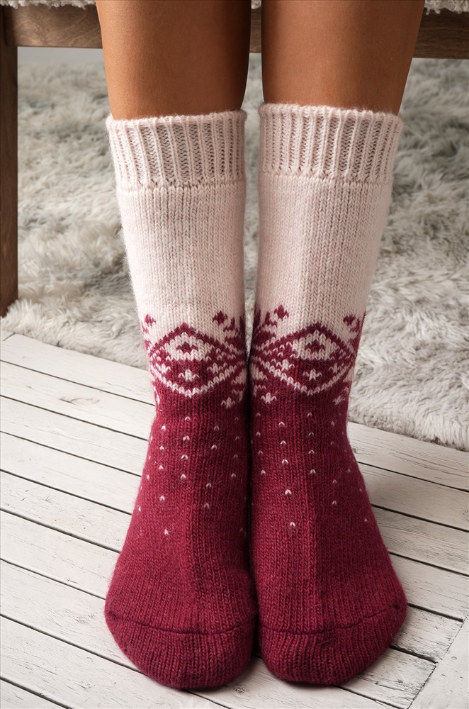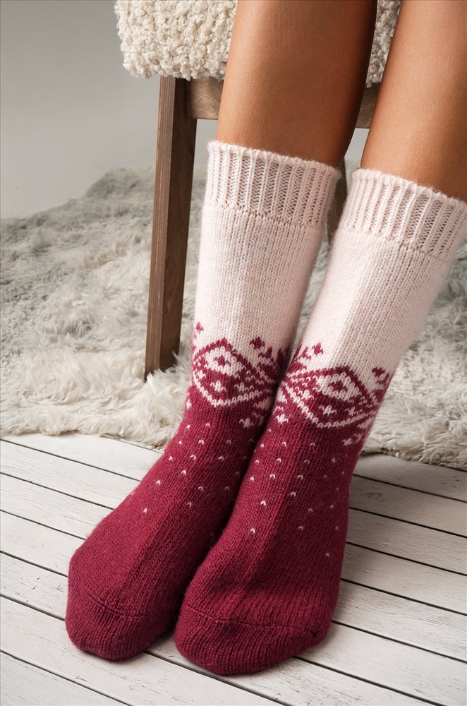 Преимущества: — шерсть в составе делает носки особенно теплыми; — вязаная структура с красивым зимним рисунком; — высокие, защищают от холода; — мягкая резинка не сдавливает ногу; — отличный домашний вариант и милый подарок. Теплые женские носочки прекрасно подойдут для дома, когда хочется уюта и нежности. Вязаные шерстяные носки с рисунком украсят зимние вечера и сделают их по-настоящему сказочными. Комментарии к товару