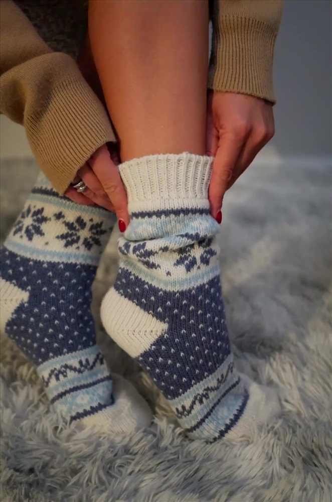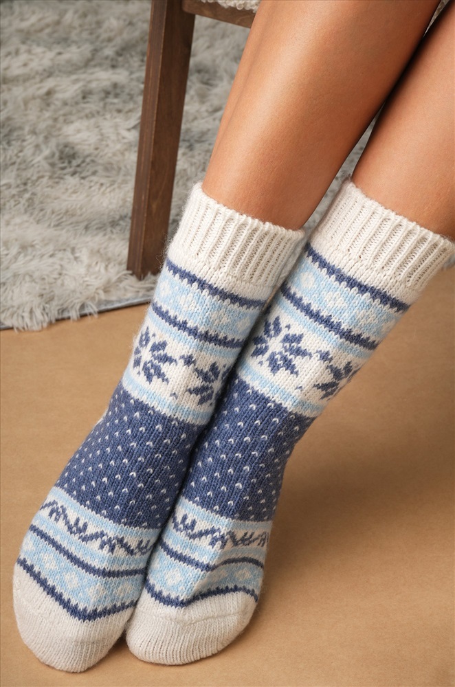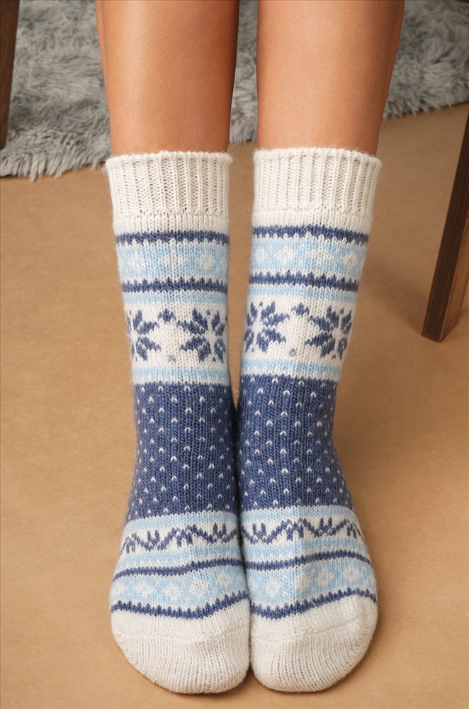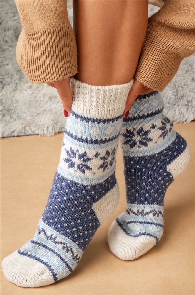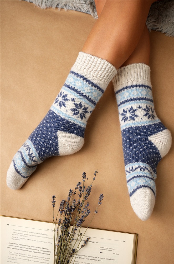 Уют начинается с деталей! Бело-голубые носочки с узором Снежинки — приятный маленький акцент в новогодней атмосфере. Женские шерстяные носки создадут уют в доме и подарят ощущение тепла. Они идеально подойдут как для себя, так и в качестве подарка на Новый год или Рождество.