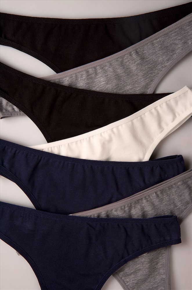 Женские трусики стринги выполнены из гипоаллергенного хлопкового трикотажа с небольшим добавлением эластана. В комплекте представлены классические стринги базовой расцветки, набор, 7 шт.