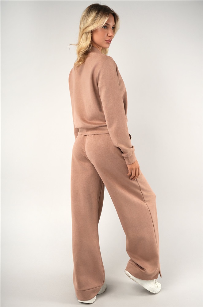 В наборе толстовка с длинным рукавом и брюки. Толстовка имеет удобную застежку на молнию и акцентный карман. Широкие брюки, элегантные отстроченные стрелки, насыщенный цвет – главные составляющие стильного костюма на эту осень.