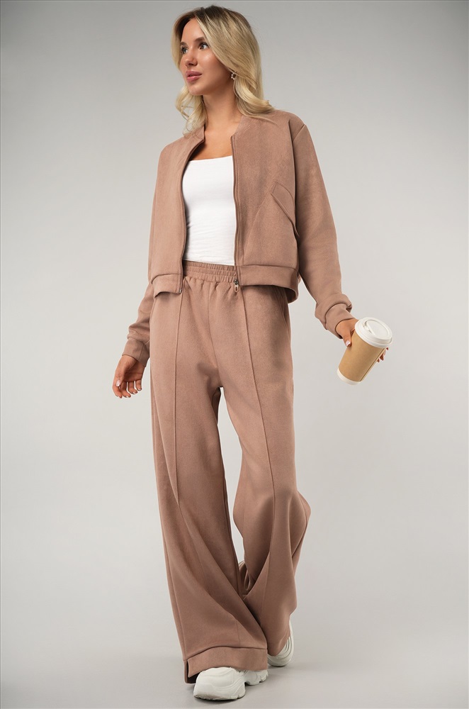 Бежевый брючный костюм выполнен из экозамши ― плотного и мягкого материала.