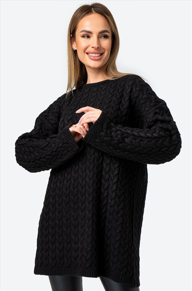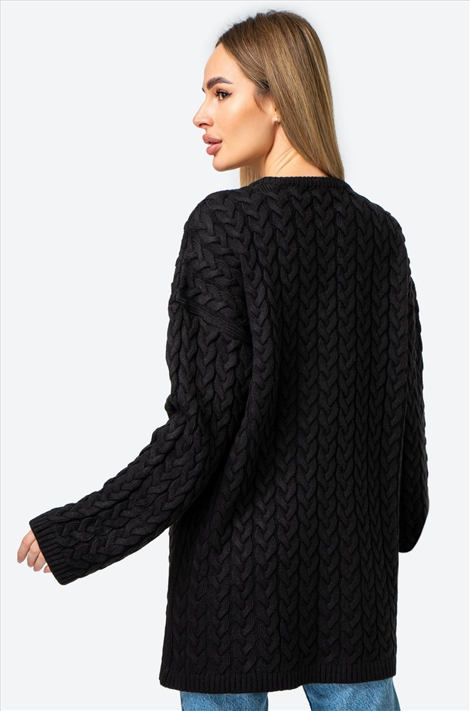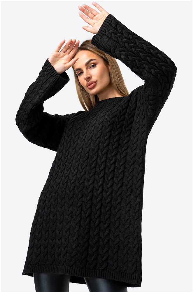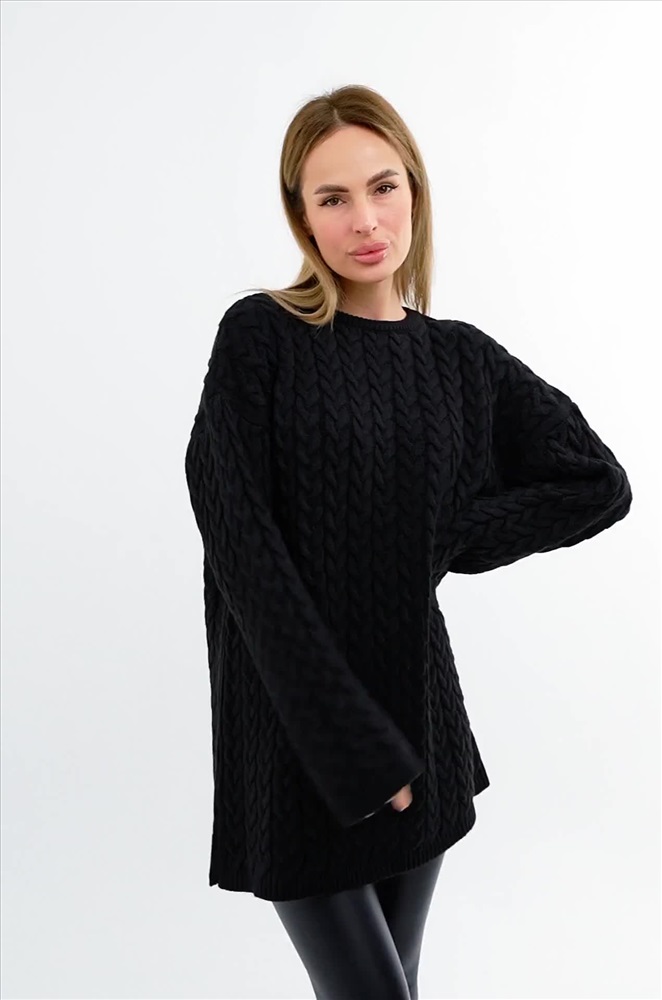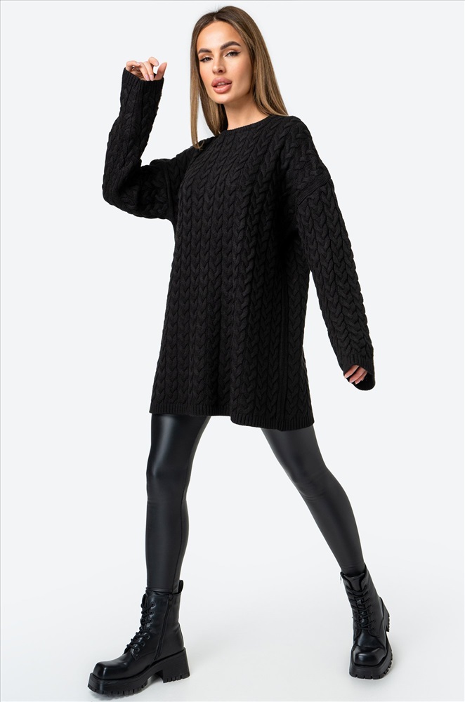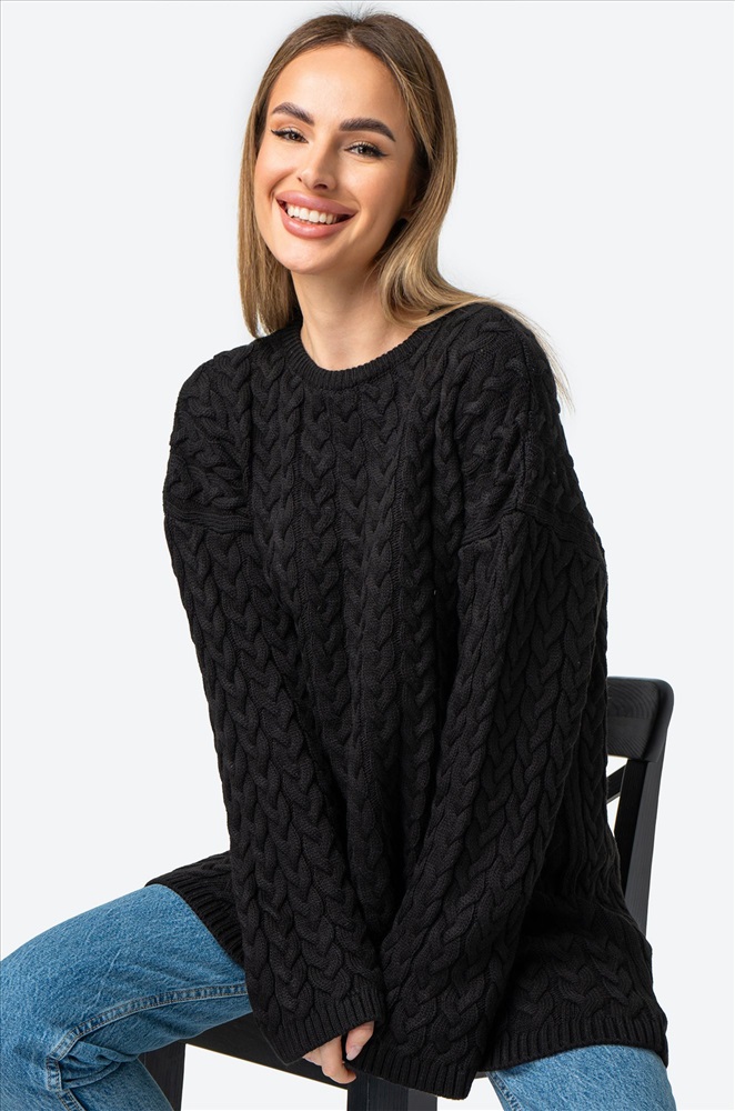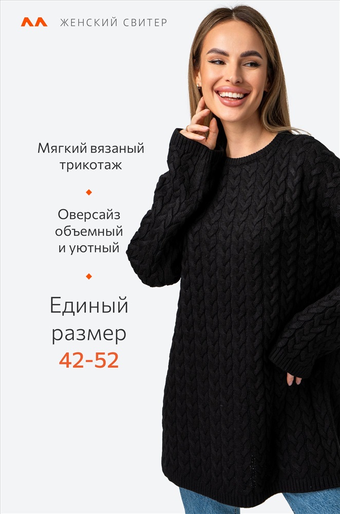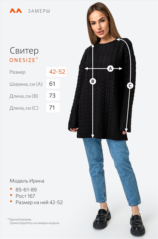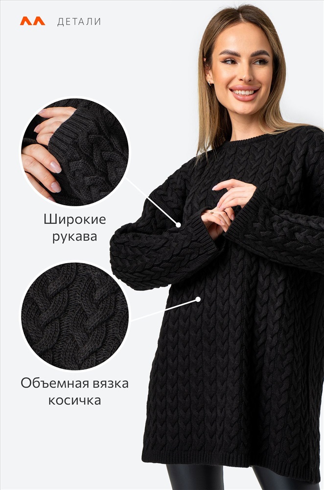 Окутывающий нежностью и заботой женский свитер черного цвета выполнен из акрила и шерсти. Удлиненный силуэт, крой оверсайз, фактурная вязка коса, уютные широкие рукава – в этом джемпере для женщин есть все, что поможет оставаться стильной в любой ситуации! Вязаное трикотажное полотно из хлопка и шерсти делает свитер onesize теплым и идеальным для осенней погоды и зимних дней. Благодаря добавлению акрила демисезонный свитер не вытягивается даже после частых стирок. Вязаный джемпер дарит комфорт и свободу движений благодаря трендовому крою oversize и длинному широкому рукаву. Узор коса добавляет нотку кокетства. Черный свитер из вязаного трикотажа поможет создать романтичный образ. Он станет крутой основой для повседневных образов в стиле smart casual (смарт кэжуал) в весенние дни. Однотонный джемпер не оставит девушку незамеченной на прогулке осенью. Морозной зимой утепленный джемпер поможет создать уютный многослойный образ.