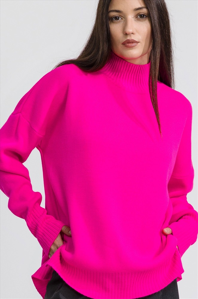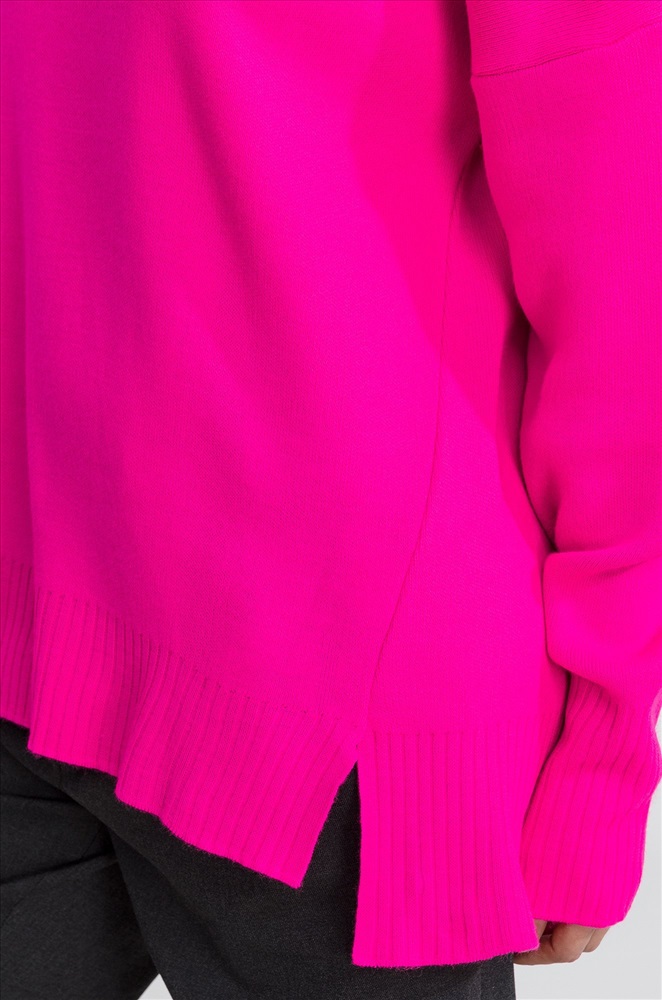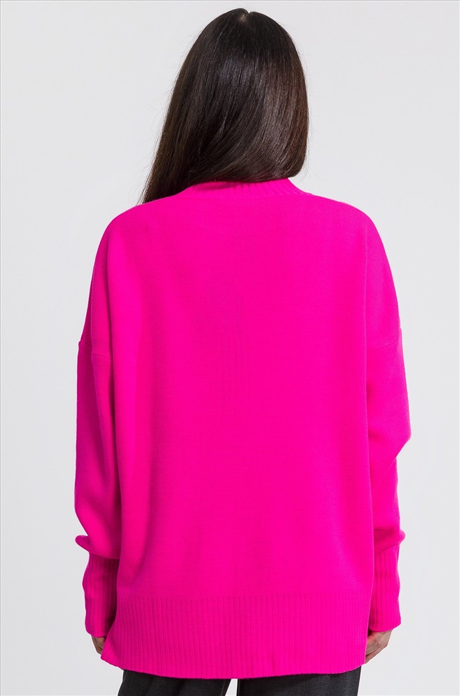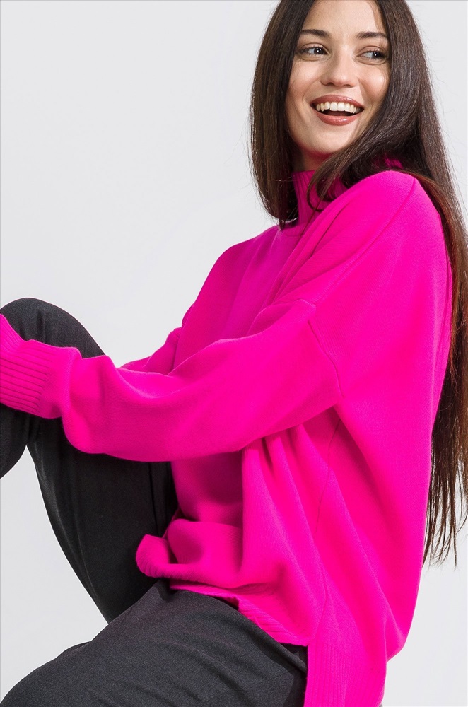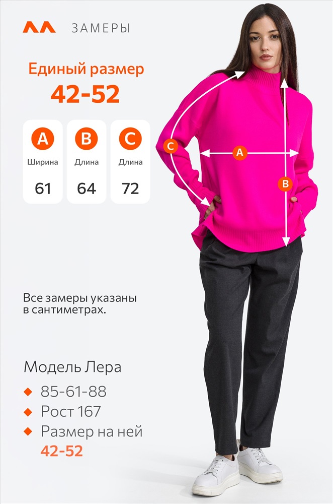 Женский розовый свитер с воротником-стойкой выполнен из вязаного трикотажа с добавлением натуральной шерсти и хлопка, что позволяет ему быть очень уютным, мягким и приятным к телу. Джемпер с высоким воротом и удлиненной спинкой позволит сохранить тепло морозной зимой. Свободный крой со спущенной линией плеча создаёт просторный силуэт, в котором можно двигаться, как хочется! Свитер оверсайз (oversize) – только легкость и максимальное удобство. Ворот защитит от прохладного ветра. По бокам имеются небольшие разрезы для удобства движений. Длинный джемпер с горлом отлично впишется в повседневные осенние или зимние образы. Однотонный свитер яркого малинового цвета для женщин отлично подходит для прогулок осенью, для повседневных образов в офис. Вязаный джемпер onesize – прекрасный вариант на каждый день. Модель Лера, ее рост 167, параметры: 85-61-88. На ней джемпер 42-52 единого размера.