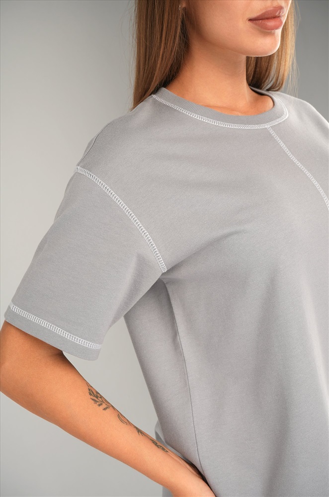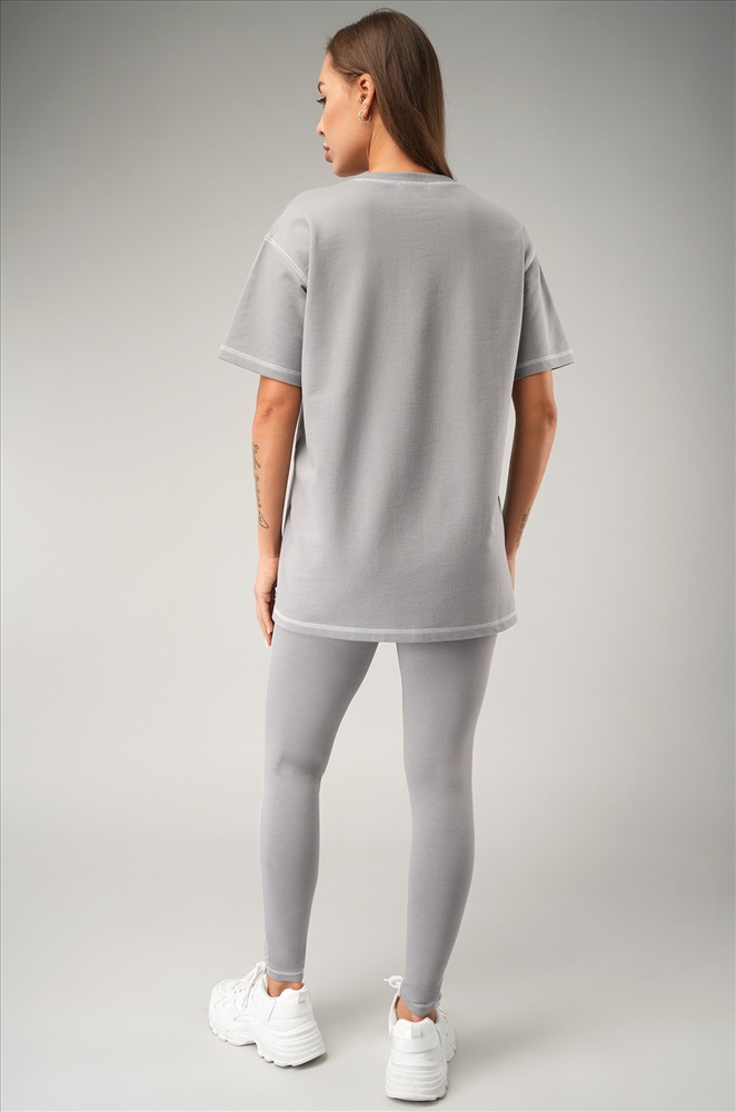 Преимущества: — костюм двойка из хлопка и лайкры с комфортной посадкой; — футболка свободного кроя из плотного хлопкового трикотажа (плотность 225 г/м2); — эластичные легинсы с удобной резинкой в поясе; — однотонный дизайн с контрастной декоративной отстрочкой; — приятная к телу ткань, дышащая и устойчивая к износу. Футболка с круглым вырезом и спущенным плечом создаёт расслабленный силуэт, а лосины подчёркивают фигуру и добавляют динамики образу. Трикотажный костюм для женщин — универсальный выбор: он отлично подойдёт для спортивных занятий в зале и станет удобным домашним комплектом на каждый день.