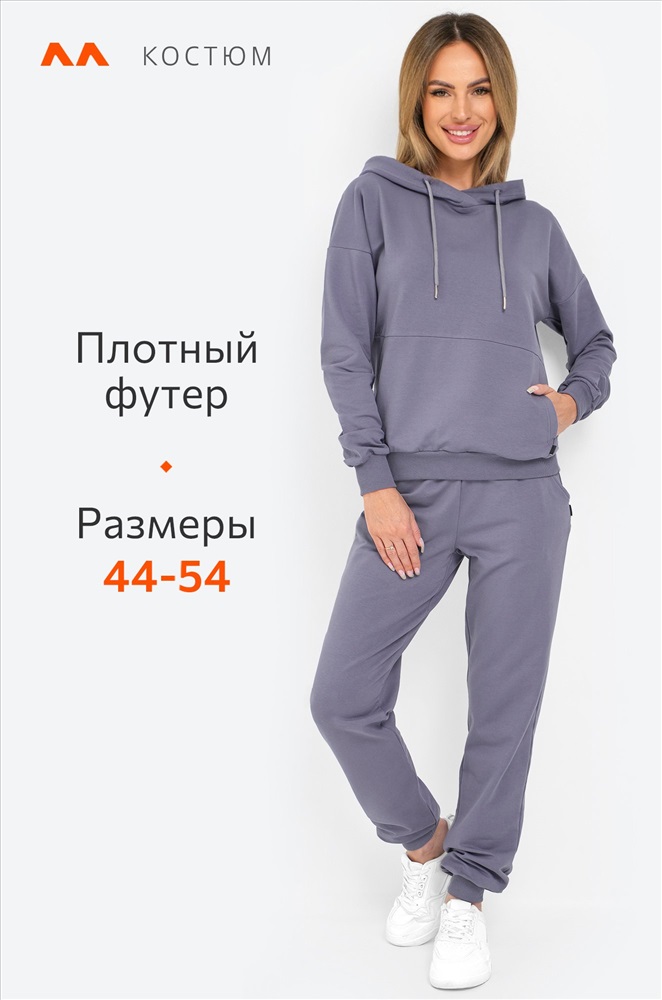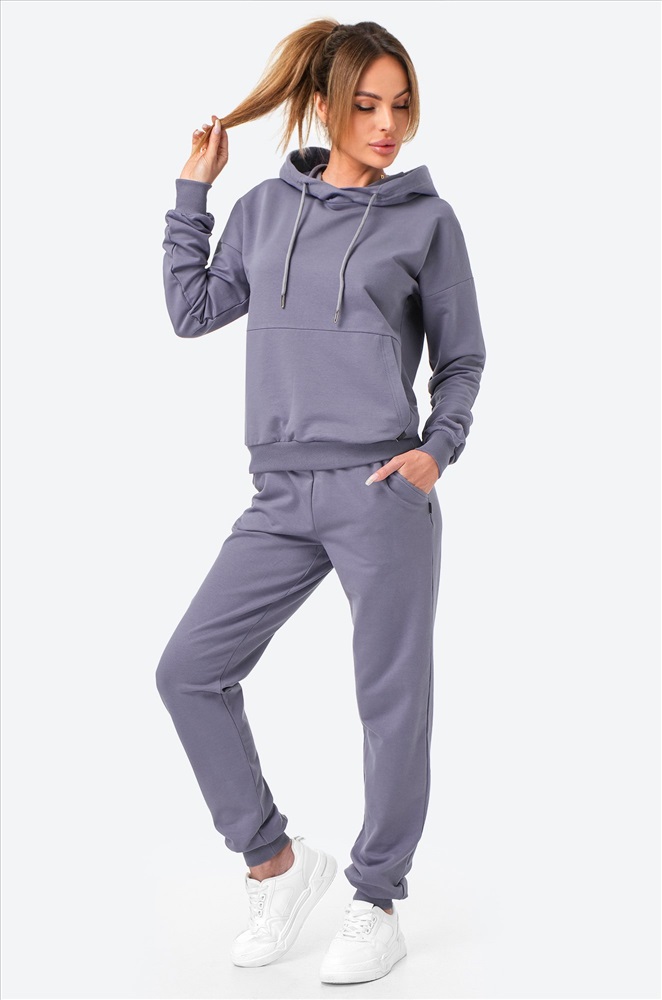Свободный крой, мягкая горловина, эластичные манжеты, практичные карманы – женский серо-голубой костюм подарит комфорт и уверенность!