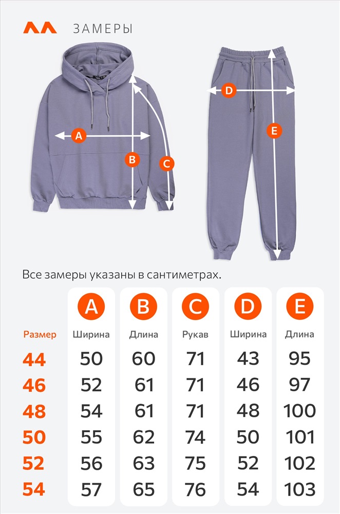 Размер 44: худи: длина:60 см; ширина:50 см; длина рукава внешняя:71 см; длина рукава внутренняя:47 см.