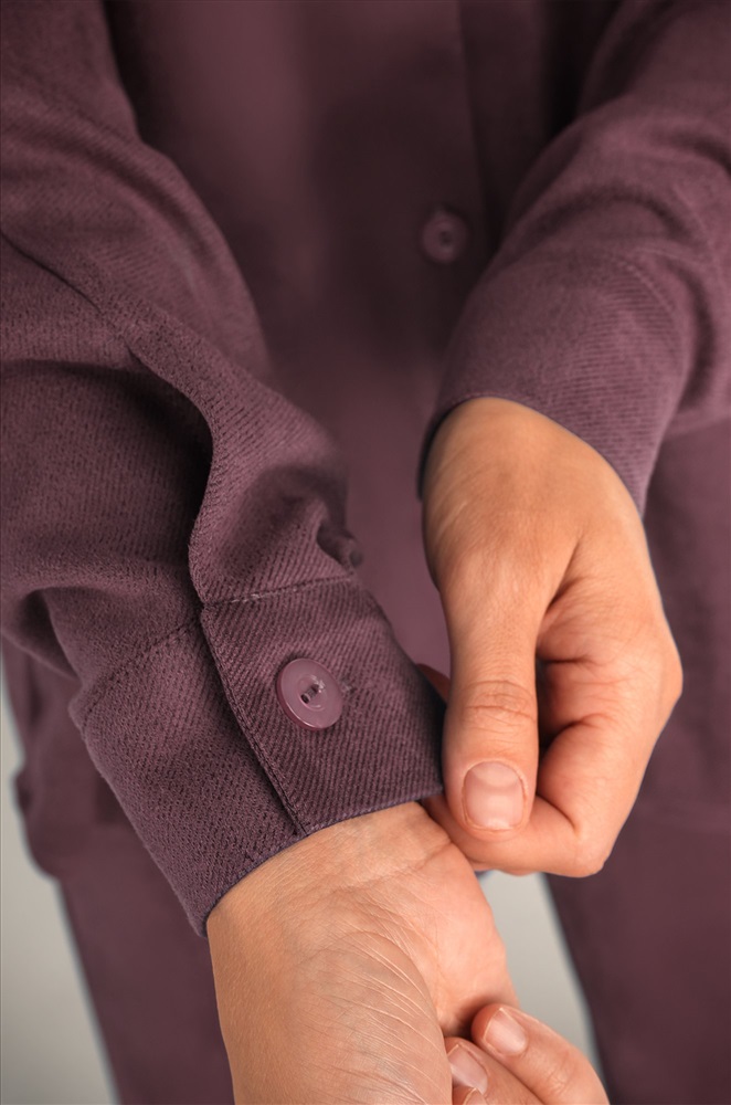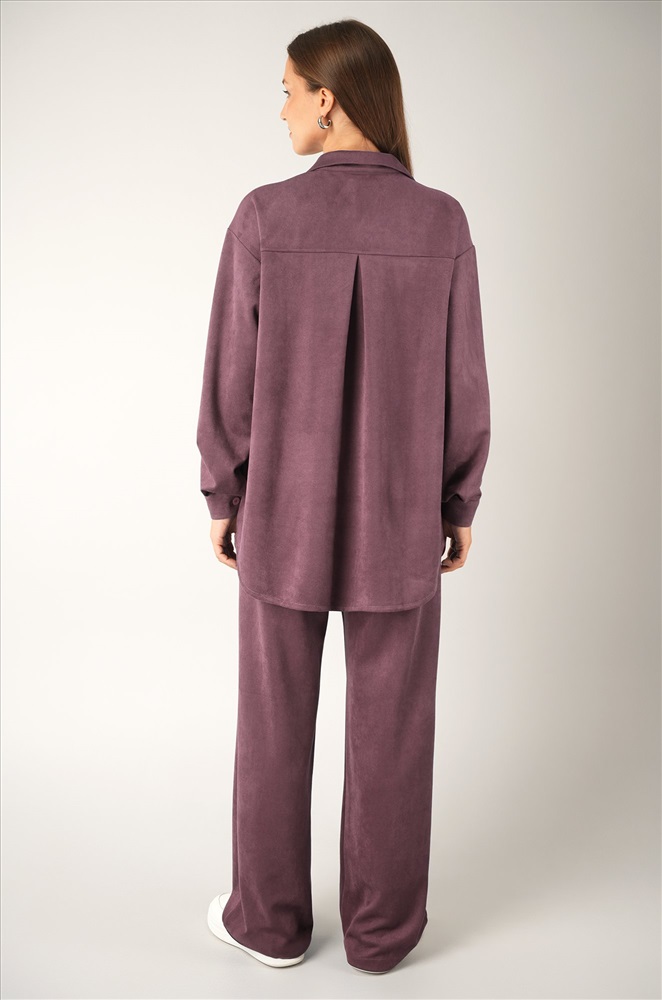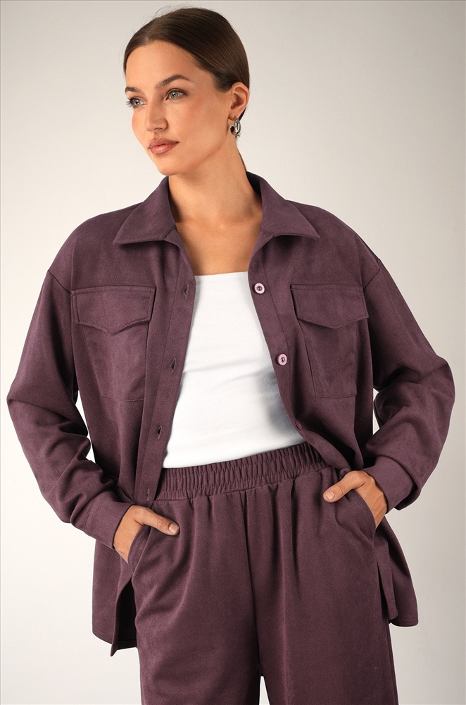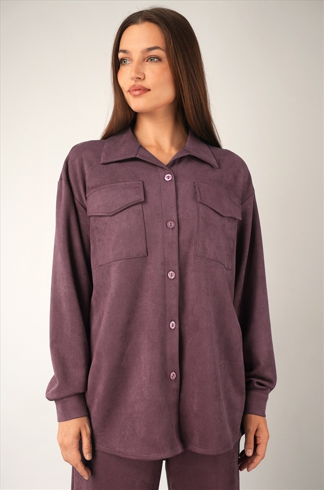 Брюки палаццо на резинке и рубашка оверсайз с нагрудными карманами создают женский комплект, который одинаково уместен для девушек и женщин и в офисе, и на прогулке. Сиреневый вельветовый костюм будет незаменим как базовый, даря комфорт в осенний или весенний сезон.