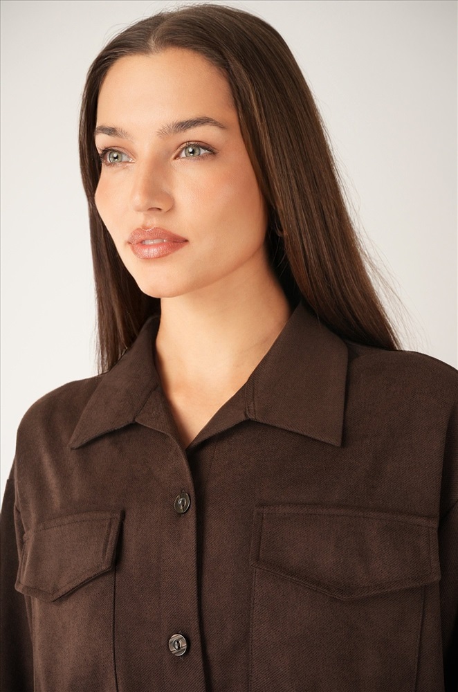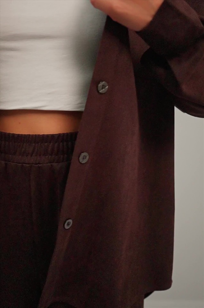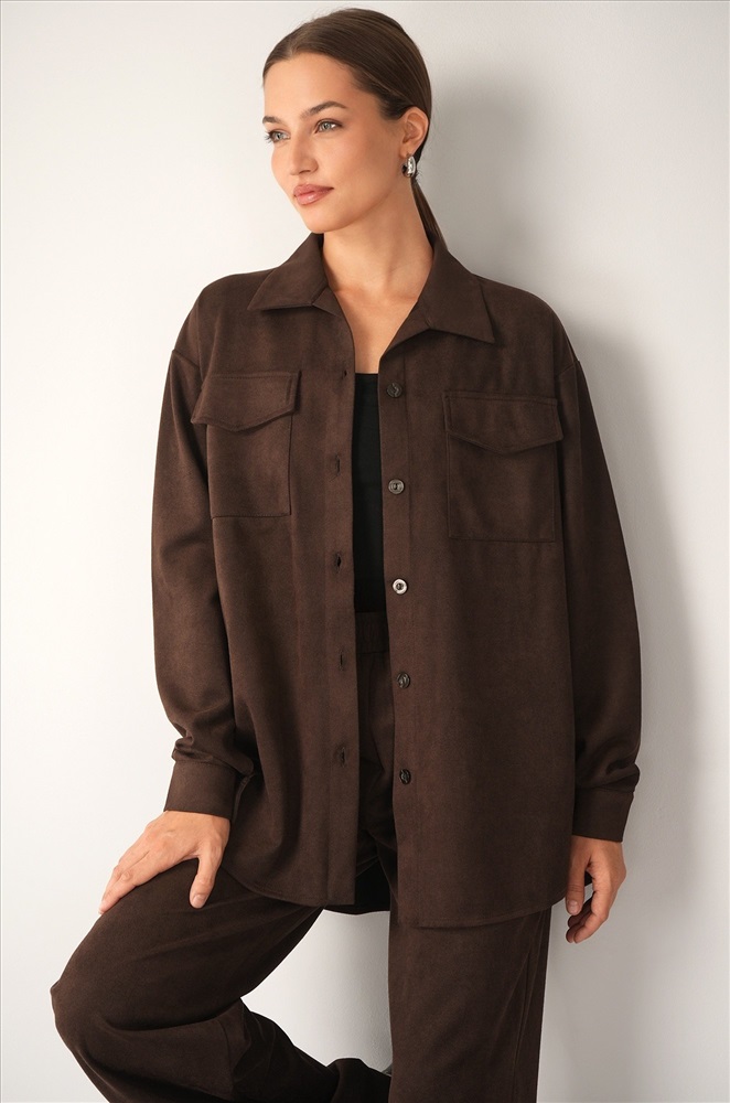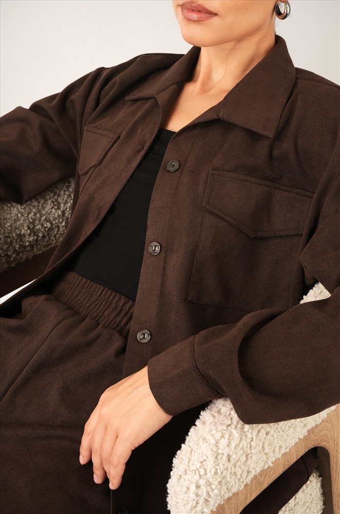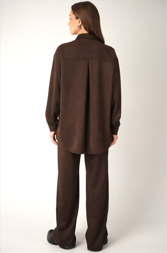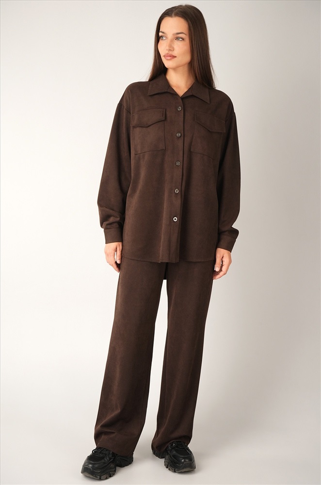 Брюки палаццо на резинке и рубашка оверсайз с нагрудными карманами создают женский комплект, который одинаково уместен для девушек и женщин и в офисе, и на прогулке. Коричневый вельветовый костюм будет незаменим как базовый, даря комфорт в осенний или весенний сезон.