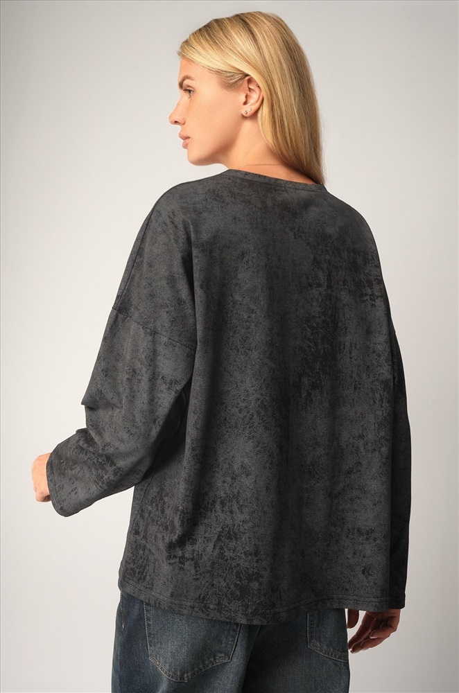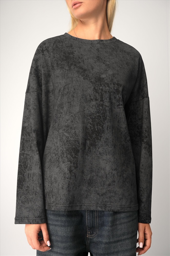 Черный лонгслив с варёным эффектом — настоящая находка для любительниц расслабленного стиля и лёгкого винтажного флёра! Женский трикотажный лонг оверсайз создан для тех, кто ценит комфорт и индивидуальность.