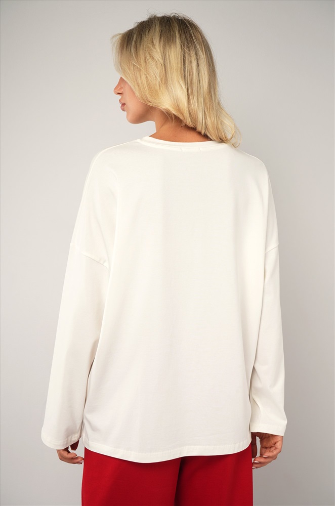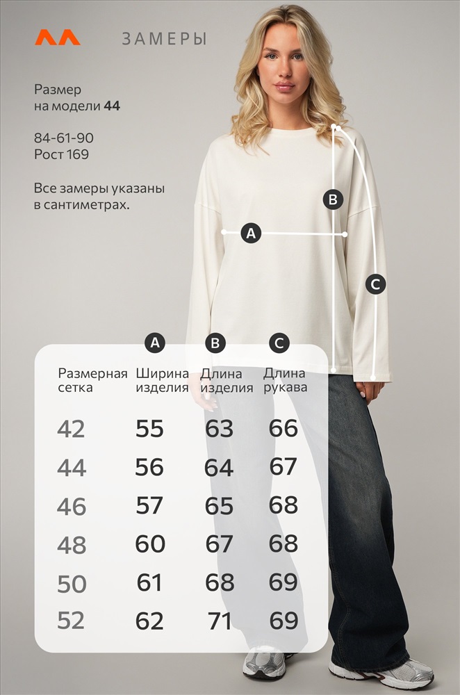Преимущества: – натуральный хлопок с добавлением эластана для комфорта (плотность 160 г/м2); – трикотажный материал мягкий и дышащий; – удобный оверсайз для свободы движений; – универсальная базовая модель на каждый день; – подходит как для девушек, так и для подростков. Прямой силуэт, спущенное плечо и круглый вырез создают расслабленный женский джемпер, который легко впишется в любой стиль. Подростковая кофта, как и белый лонгслив для женщин подойдёт для офиса и для прогулки — всегда выглядит легко и современно. Рост модели 169 см, параметры: объем груди 84, объем талии 61, объем бедер 90. На ней размер 44.