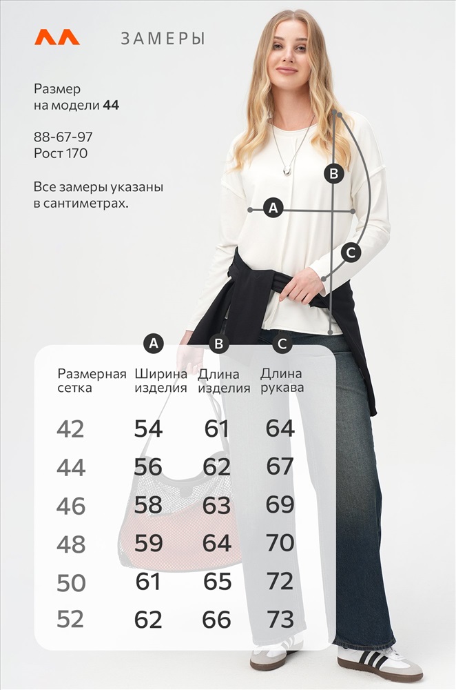 Размер 42: длина:61 см; ширина:54 см; длина рукава внешняя:64 см; длина рукава внутренняя:39 см.