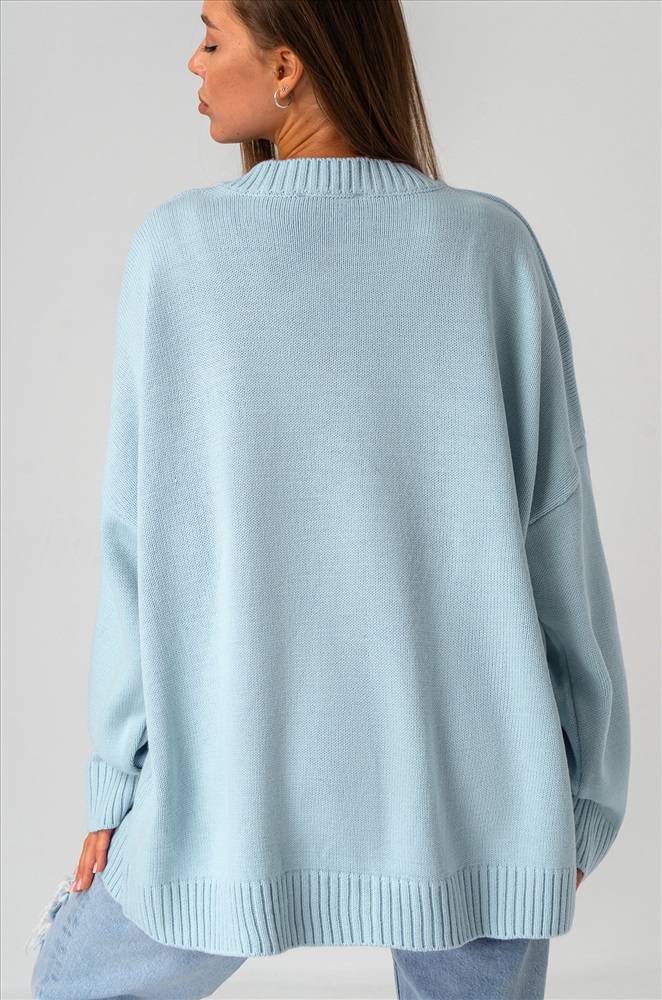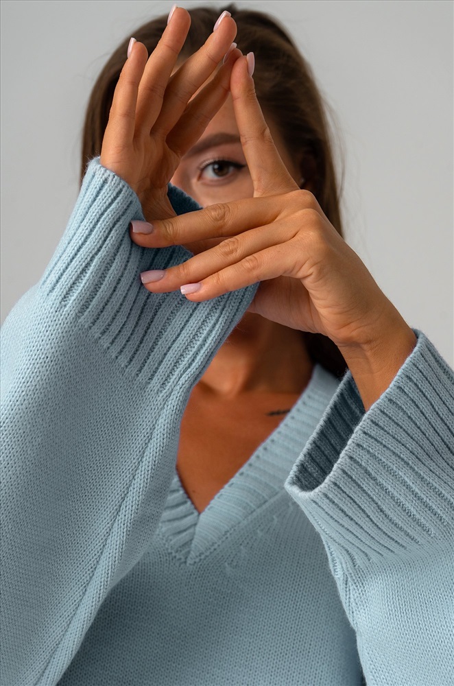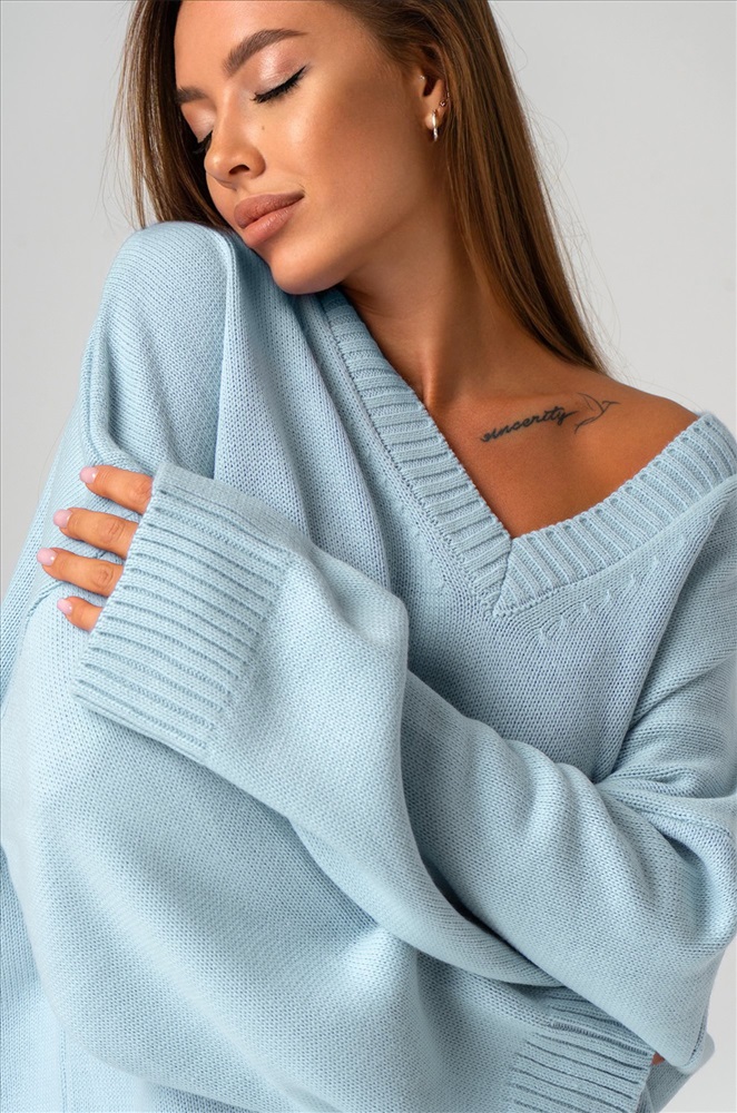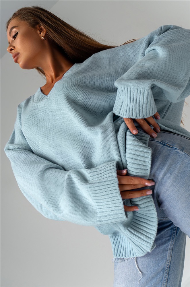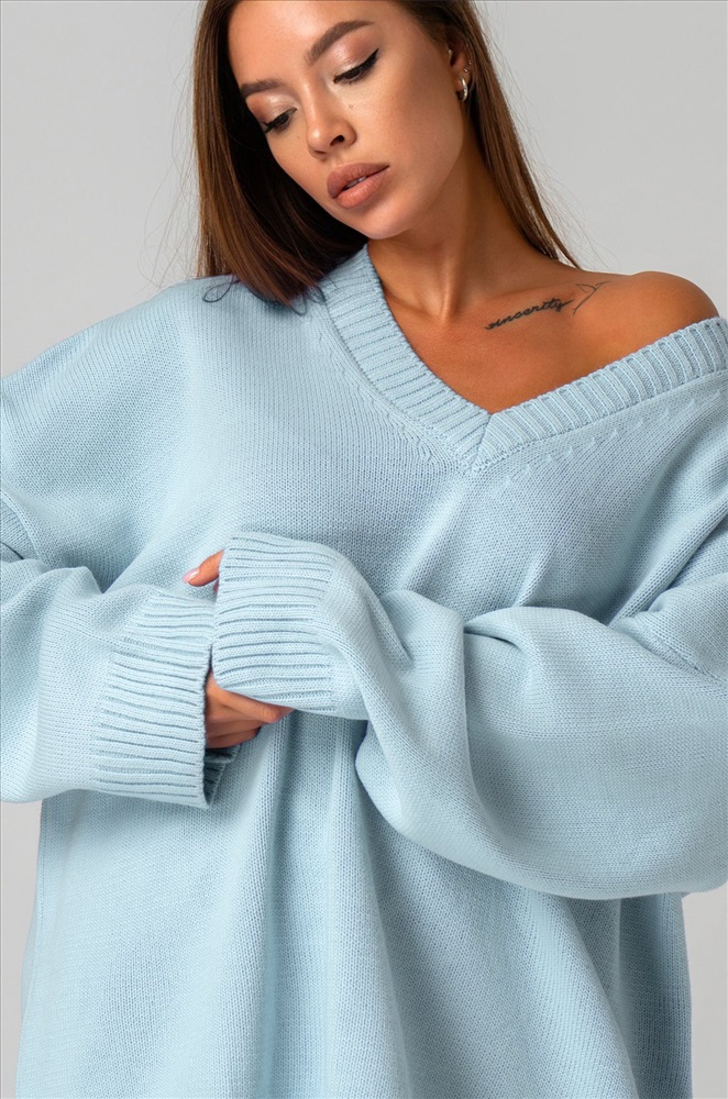 Окутывающий нежностью и заботой женский свитер оверсайз выполнен из акрила и шерсти. Удлиненный силуэт, крой oversize, v-образный вырез, длинные рукава – в этом джемпере для женщин есть все, что поможет оставаться стильной в любой ситуации! Вязаное трикотажное полотно из хлопка и шерсти делает свитер onesize теплым и идеальным для весенней погоды и даже зимних дней. Благодаря добавлению акрила демисезонный свитер небесно-голубого цвета не вытягивается даже после частых стирок. Модель объёмного силуэта со спущенной линией плеча поможет создать романтичный образ. Модель дополнена ребристой отделкой выреза, низа и манжет. Голубой свитер из вязаного трикотажа станет крутой основой для повседневных образов в стиле smart casual (смарт кэжуал) в осенние и зимние дни. Однотонный джемпер с v-вырезом не оставит девушку незамеченной на прогулке осенью. Морозной зимой утепленный джемпер поможет создать уютный многослойный образ. Модель Анфиса, ее рост 170, параметры: 88-67-97. На ней единый размер 44-52.