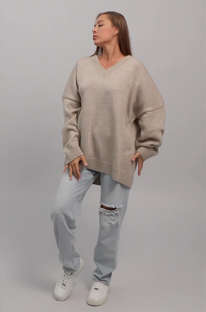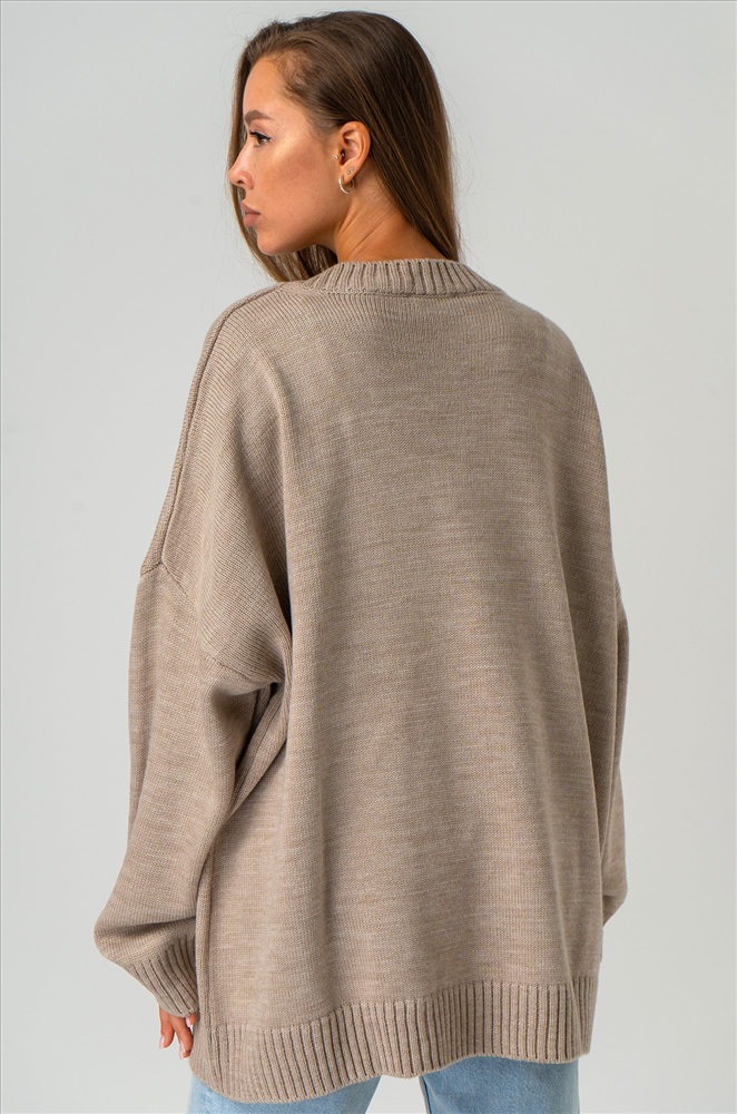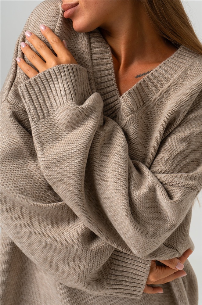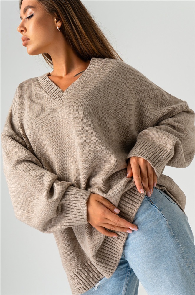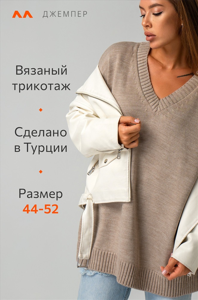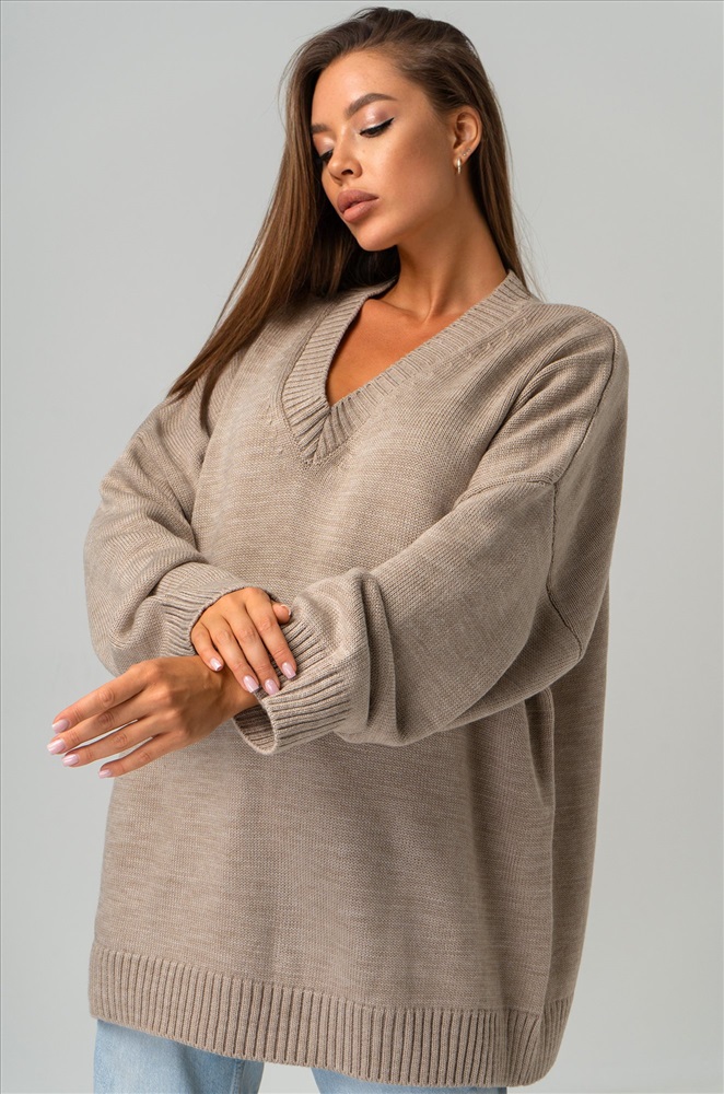 Окутывающий нежностью и заботой женский свитер оверсайз выполнен из акрила и шерсти. Удлиненный силуэт, крой oversize, v-образный вырез, длинные рукава – в этом джемпере для женщин есть все, что поможет оставаться стильной в любой ситуации! Вязаное трикотажное полотно из хлопка и шерсти делает свитер onesize теплым и идеальным для весенней погоды и даже зимних дней. Благодаря добавлению акрила демисезонный коричневый свитер не вытягивается даже после частых стирок. Модель объёмного силуэта со спущенной линией плеча поможет создать романтичный образ. Модель дополнена ребристой отделкой выреза, низа и манжет. Свитер из вязаного трикотажа станет крутой основой для повседневных образов в стиле smart casual (смарт кэжуал) в осенние и зимние дни. Однотонный джемпер с v-вырезом не оставит девушку незамеченной на прогулке осенью. Морозной зимой утепленный джемпер поможет создать уютный многослойный образ. Модель Анфиса, ее рост 170, параметры: 88-67-97. На ней единый размер 44-52.