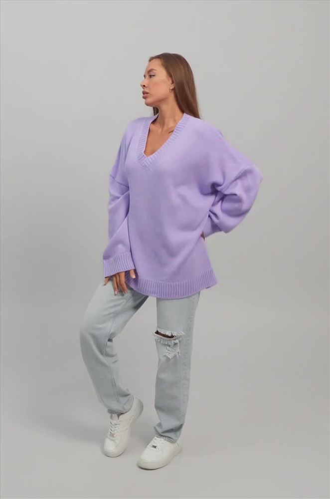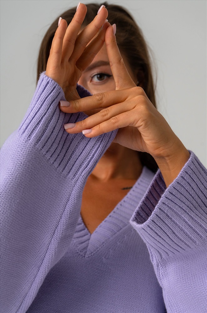 Сиреневый свитер из вязаного трикотажа станет крутой основой для повседневных образов в стиле smart casual (смарт кэжуал) в осенние и зимние дни. Однотонный джемпер с v-вырезом не оставит девушку незамеченной на прогулке осенью. Морозной зимой утепленный джемпер поможет создать уютный многослойный образ.