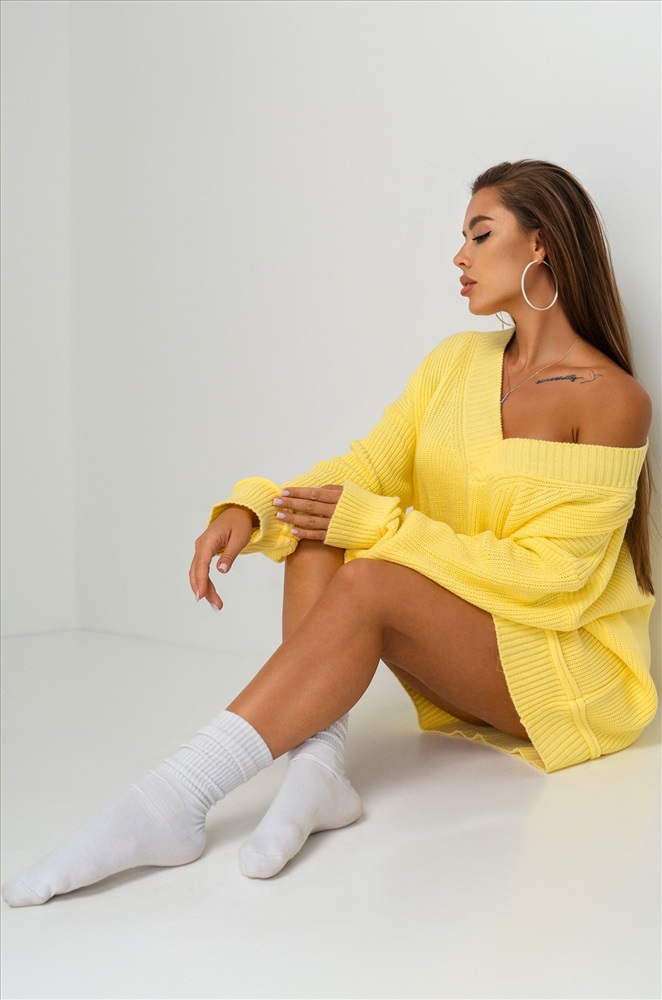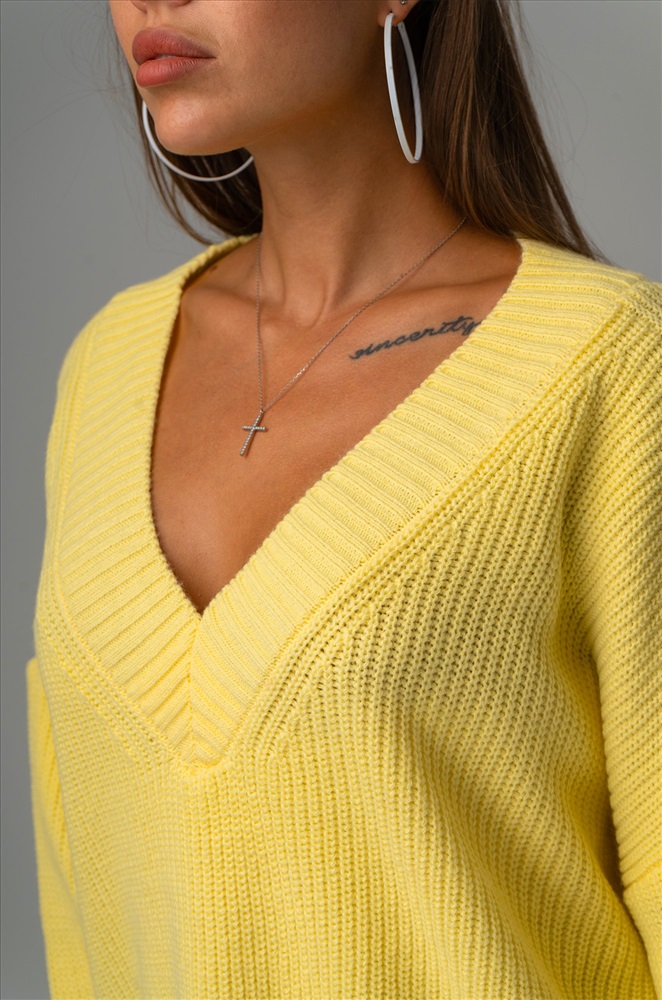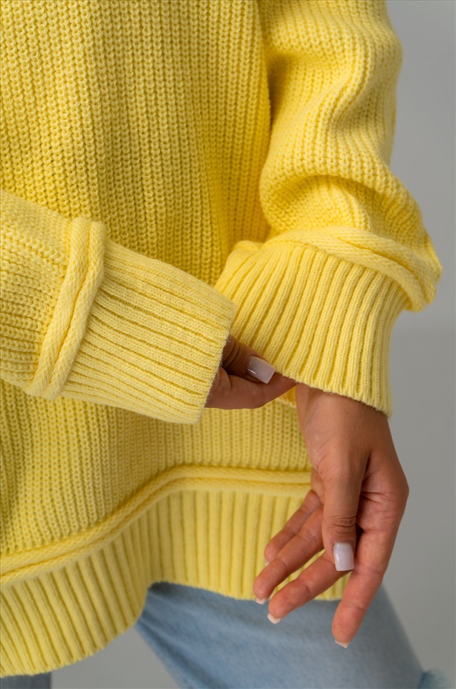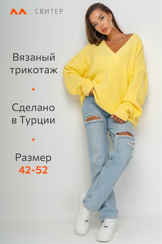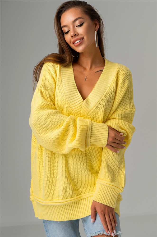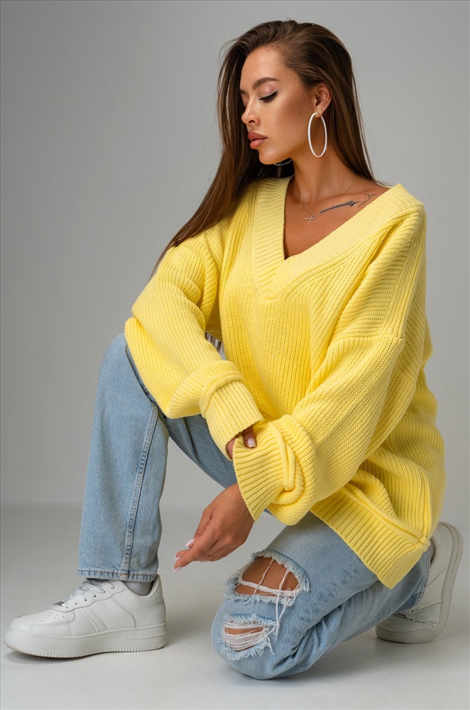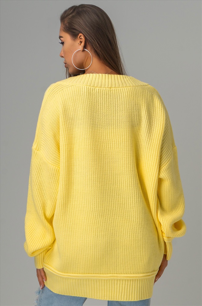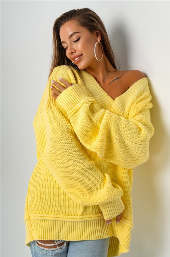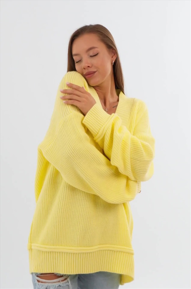 Женский джемпер в желтом цвете станет идеальным выбором для создания классного образа. Оверсайз фасон и V-образный вырез добавят легкости и элегантности, а длинный рукав гарантирует комфорт в прохладную погоду. Выполненный из вязаного трикотажа однотонный свитер отличается мягкостью и теплотой. Такой материал прекрасно держит тепло, при этом оставаясь дышащим и приятным к телу. Вязаный джемпер имеет свободный крой и спущенное плечо, что придает ему модный и расслабленный вид. Низ пуловера и рукава украшены декоративными элементами. Демисезонная модель — универсальный элемент гардероба. Удлиненный вязаный свитер будет идеален для женщин, которые ценят комфорт и стиль. Универсальный размер 42-52 подходит для любого типа телосложения. Модель Анфиса, рост 170 см, параметры 88-67-97 см. На ней единый размер 42-52.