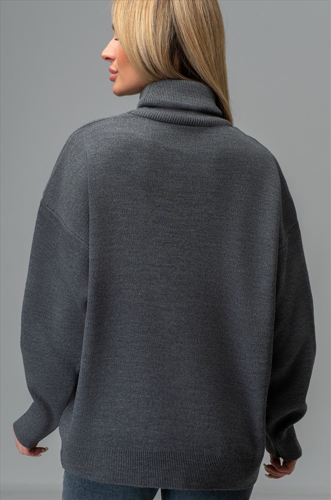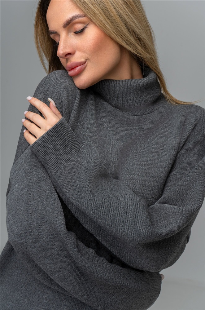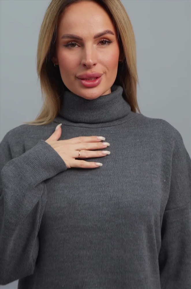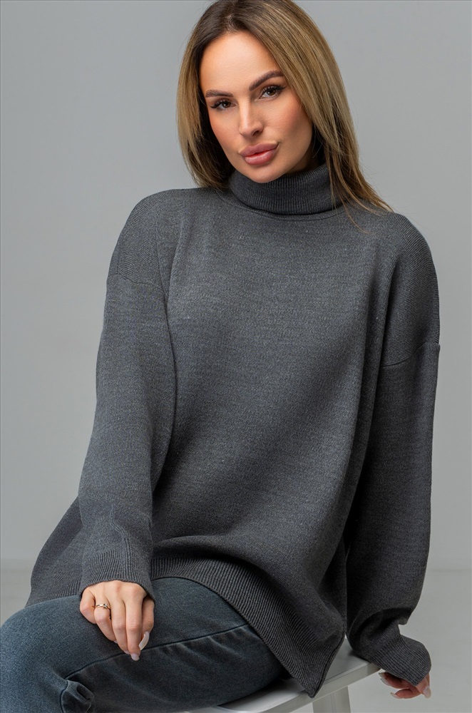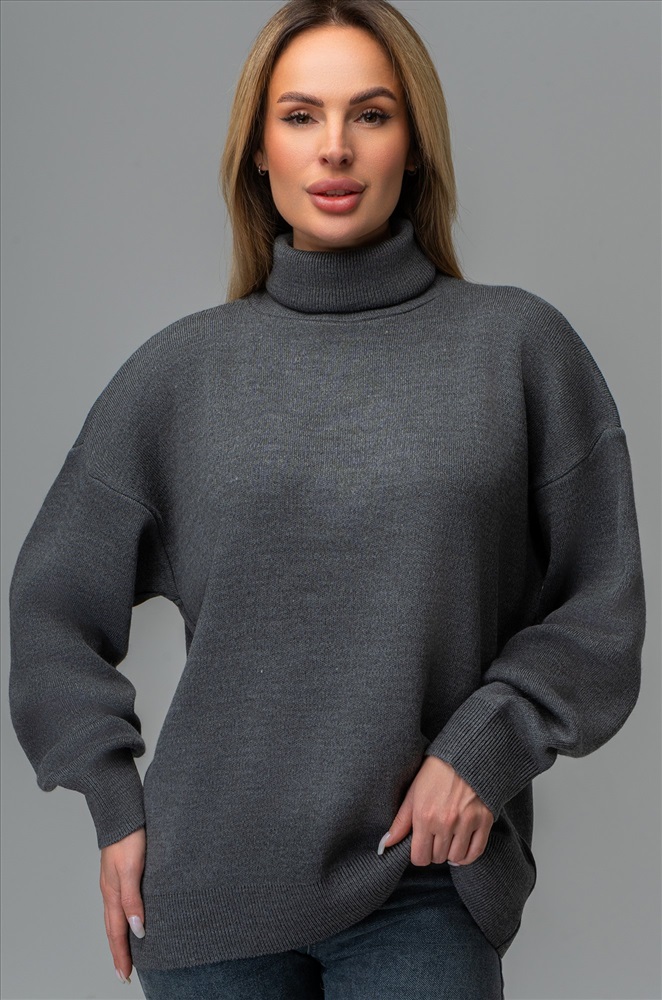 Удлиненный свитер графитового цвета выполнен из вязаного трикотажа с добавлением натуральной шерсти и хлопка, что позволяет ему быть очень уютным, мягким и приятным к телу. Женский джемпер с высоким воротом позволит сохранить тепло морозной зимой.