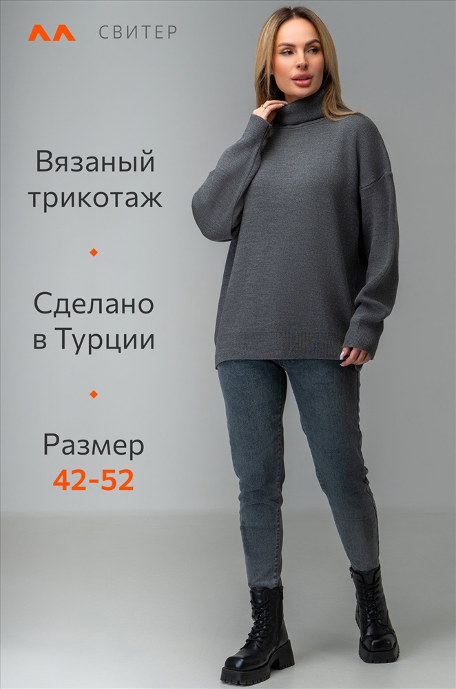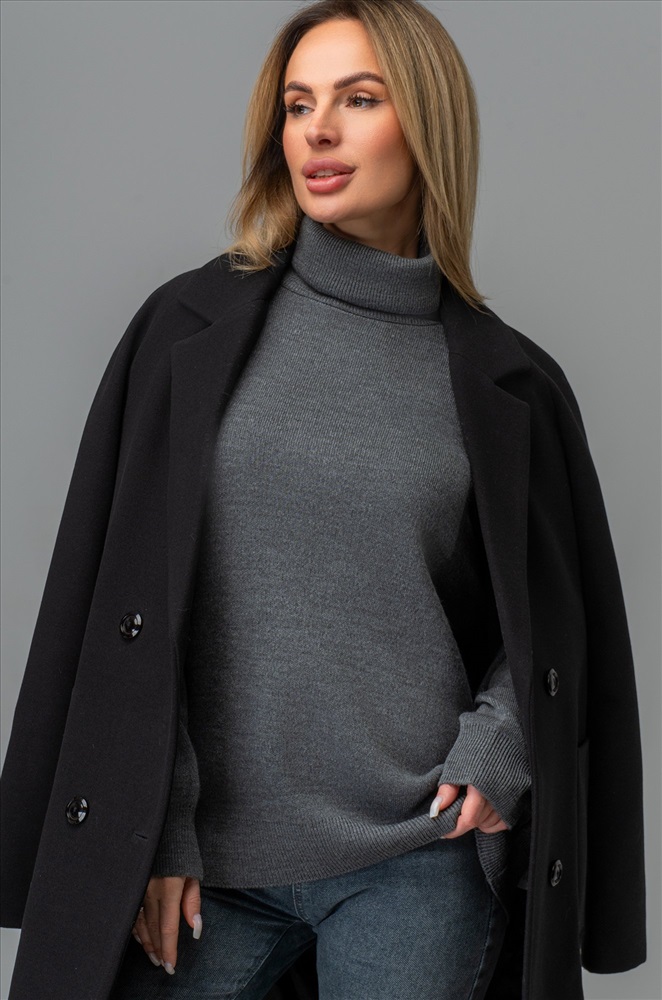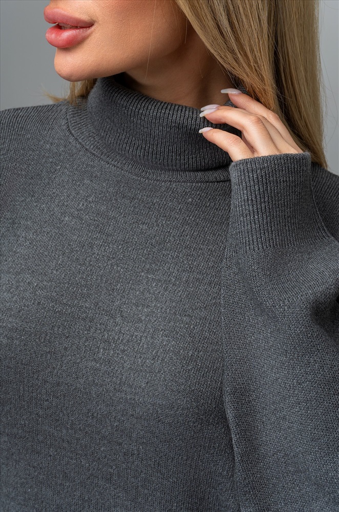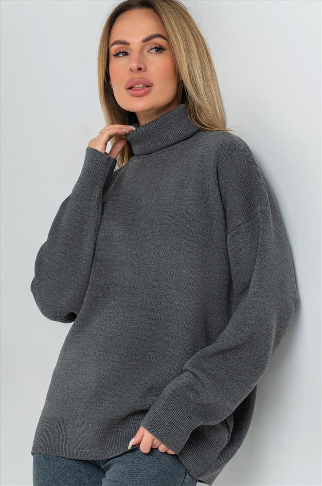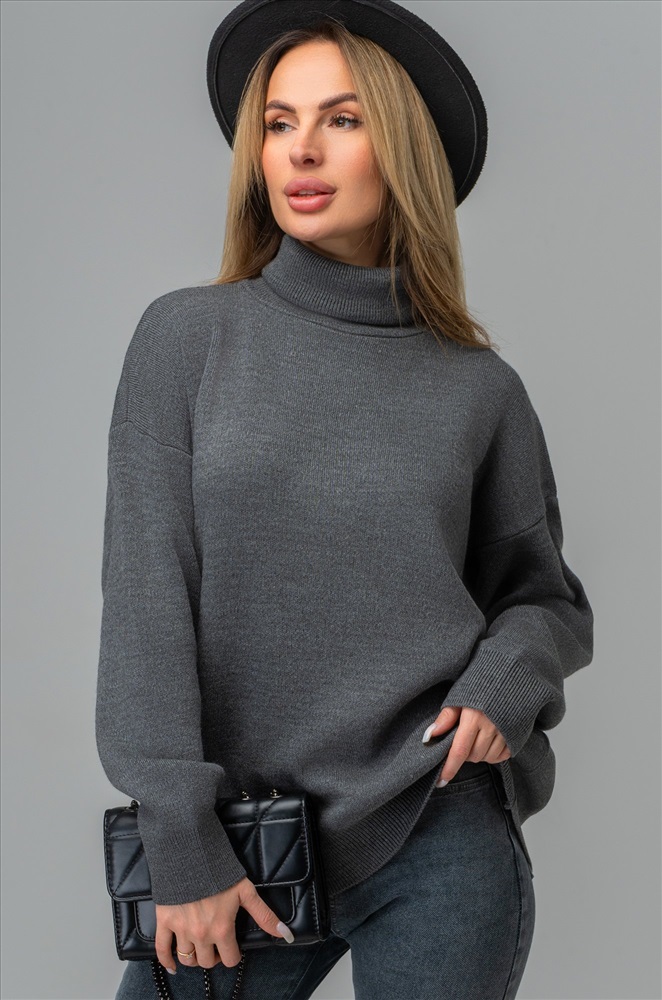 Удлиненный свитер графитового цвета выполнен из вязаного трикотажа с добавлением натуральной шерсти и хлопка, что позволяет ему быть очень уютным, мягким и приятным к телу. Женский джемпер с высоким воротом позволит сохранить тепло морозной зимой.