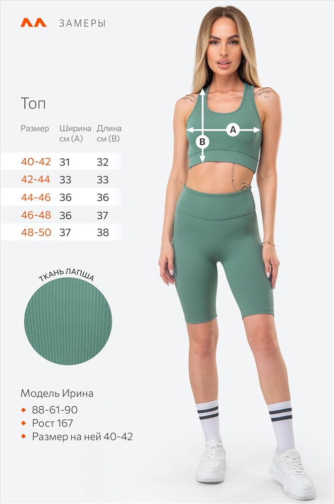 Модель Ирина, рост 167 см. Параметры 88-61-90 см. На ней топ размера 40-42 см.