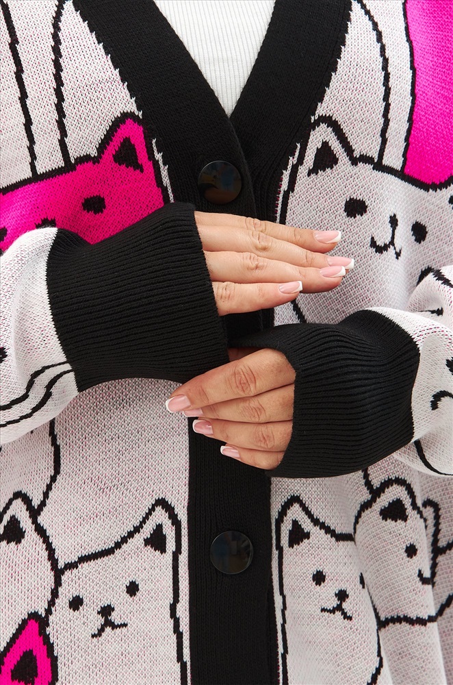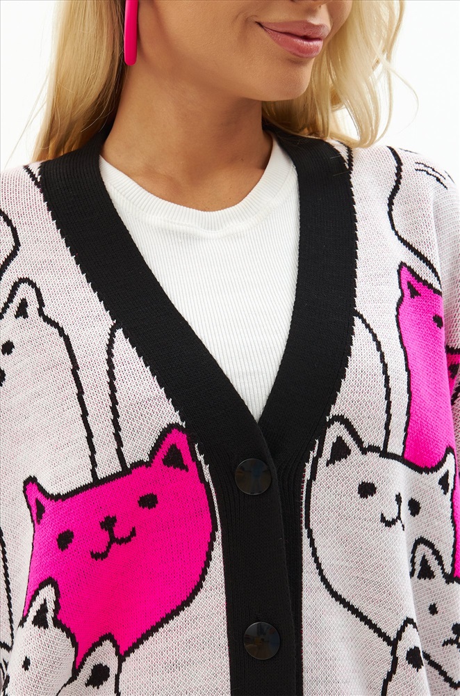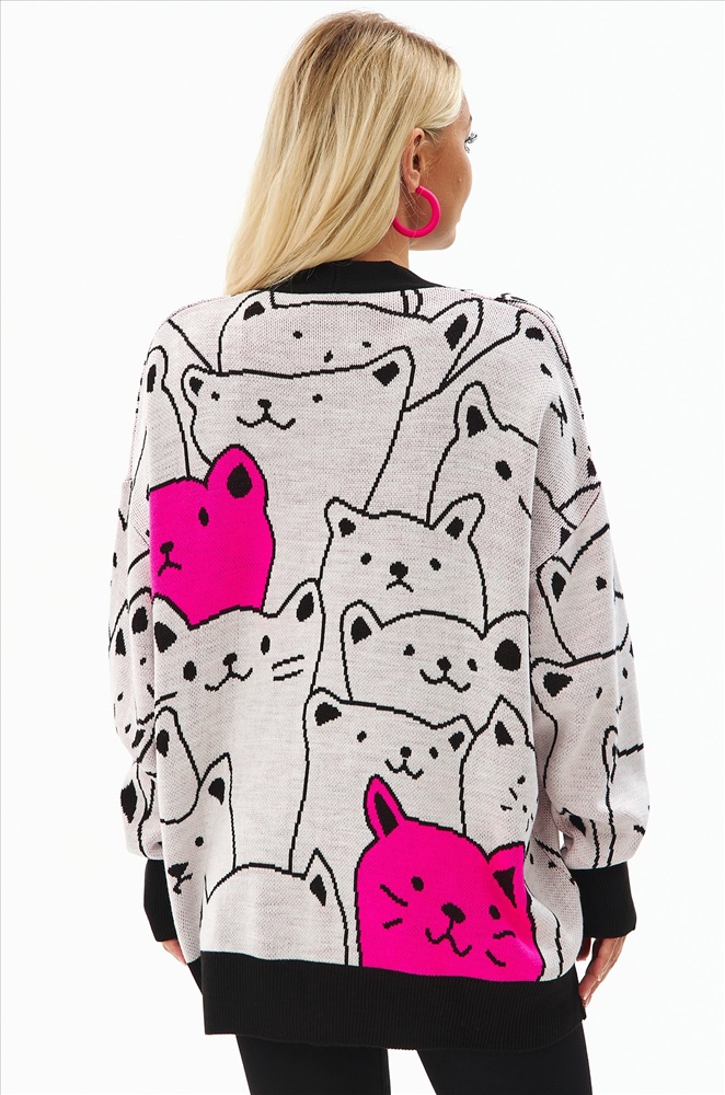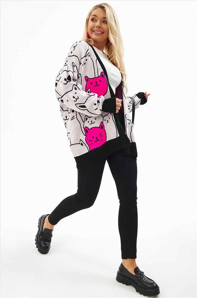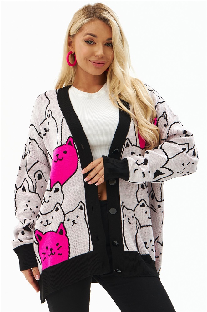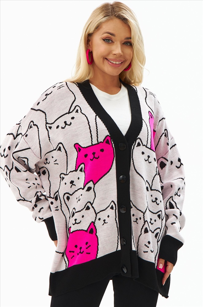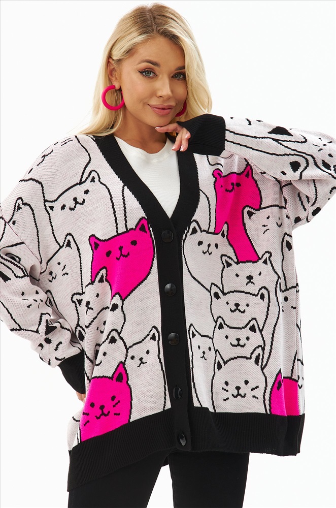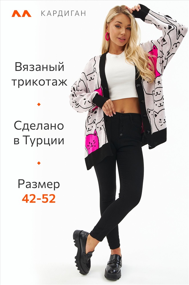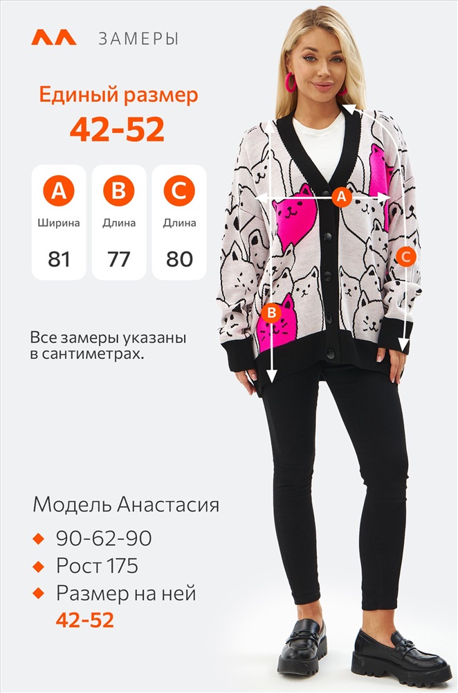 Женский кардиган с рисунком кошки — находка для тех, кто любит весело и тепло проводить зимние дни. Удлиненная кофта оверсайз с оригинальным рисунком наполнит уютом каждый день. Вязаный трикотаж с хлопком, шерстью и акрилом в составе подарит мягкость и тепло, которые необходимы в холодное время года. Идеальное сочетание делает кардиган приятным на ощупь и стойким к износу. Свободный крой, длинные рукава и спущенное плечо придают модели расслабленный вид, а забавный рисунок котики добавляют уникальности. Трикотажная кофта с застежкой на пуговицы подойдет для женщин, которые ценят комфорт и немного веселья. Она идеальна для уютных вечеров дома или прогулок по городу. Благодаря универсальному размеру кардиган подходит для любого типа фигуры. Модель Анастасия, рост 175 см, параметры 90-62-90 см. На ней кофта единого размера 42-52.